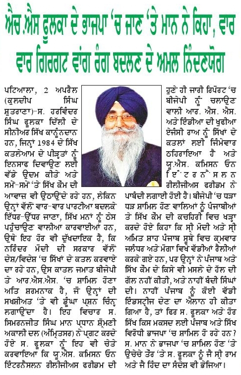 ਸ. ਐਚ.ਐਸ ਫੂਲਕਾ ਇਕ ਚੰਗੇ ਸਿੱਖ ਕਾਨੂੰਨਦਾਨ ਹਨ, ਜਿਨ੍ਹਾਂ ਦੇ ਬੀਤੇ ਸਮੇਂ ਦੇ ਉਦਮ ਸਲਾਘਾਯੋਗ ਹਨ ਪਰ ਉਨ੍ਹਾਂ ਵੱਲੋਂ ਗਿਰਗਟ ਵਾਂਗ ਰੰਗ ਬਦਲਣ ਦੇ ਅਮਲ ਅਤਿ ਦੁੱਖਦਾਇਕ : ਮਾਨ