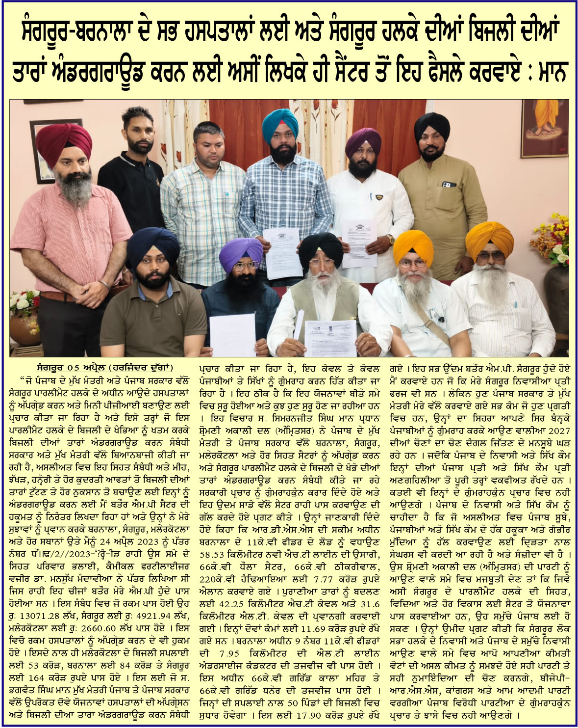 ਸੰਗਰੂਰ-ਬਰਨਾਲਾ ਦੇ ਸਭ ਹਸਪਤਾਲਾਂ ਲਈ ਅਤੇ ਸੰਗਰੂਰ ਹਲਕੇ ਦੀਆਂ ਬਿਜਲੀ ਦੀਆਂ ਤਾਰਾਂ ਅੰਡਰਗਰਾਊਡ ਕਰਨ ਲਈ ਅਸੀਂ ਲਿਖਕੇ ਹੀ ਸੈਂਟਰ ਤੋਂ ਇਹ ਫੈਸਲੇ ਕਰਵਾਏ : ਮਾਨ