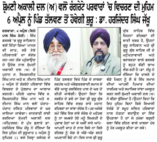 ਸ਼੍ਰੋਮਣੀ ਅਕਾਲੀ ਦਲ (ਅੰਮ੍ਰਿਤਸਰ) ਵੱਲੋਂ ਰੰਗਰੇਟੇ ਪਰਿਵਾਰਾਂ ‘ਚ ਵਿਚਰਣ ਦੀ ਮੁਹਿੰਮ 6 ਅਪ੍ਰੈਲ ਨੂੰ ਪਿੰਡ ਤੱਲਵਣ ਤੋ ਹੋਵੇਗੀ ਸੁਰੂ : ਜੱਖੂ