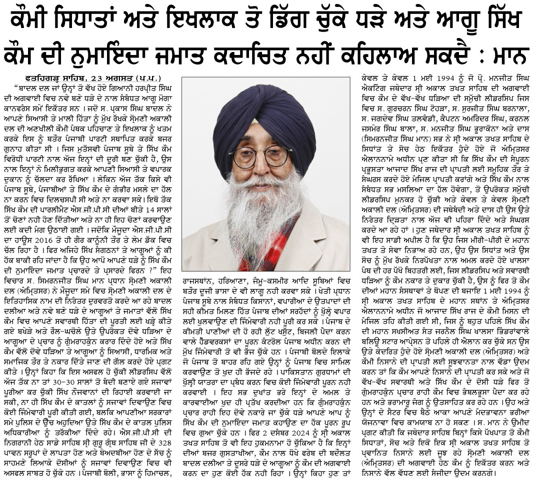 ਕੌਮੀ ਸਿਧਾਤਾਂ ਅਤੇ ਇਖਲਾਕ ਤੋ ਡਿੱਗ ਚੁੱਕੇ ਧੜੇ ਅਤੇ ਆਗੂ ਸਿੱਖ ਕੌਮ ਦੀ ਨੁਮਾਇੰਦਾ ਜਮਾਤ ਕਦਾਚਿਤ ਨਹੀ ਕਹਿਲਾਅ ਸਕਦੈ : ਮਾਨ