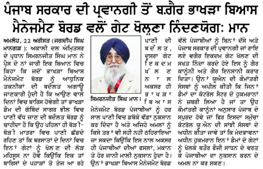 ਪੰਜਾਬ ਸਰਕਾਰ ਦੀ ਪ੍ਰਵਾਨਗੀ ਤੋ ਬਗੈਰ ਭਾਖੜਾ ਬਿਆਸ ਮੈਨੇਜਮੈਟ ਬੋਰਡ ਦੇ ਗੇਟ ਖੋਲਣਾ ਨਿੰਦਣਯੋਗ : ਮਾਨ