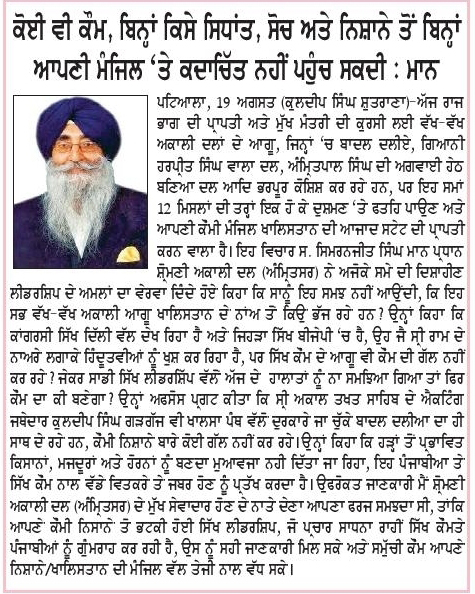 ਬਿਨ੍ਹਾਂ ਕਿਸੇ ਸਿਧਾਂਤ, ਸੋਚ ਅਤੇ ਨਿਸ਼ਾਨੇ ਤੋਂ ਕੋਈ ਵੀ ਕੌਮ ਆਪਣੀ ਮੰਜਿਲ ਤੇ ਨਹੀ ਪਹੁੰਚ ਸਕਦੀ : ਮਾਨ ਫ਼ਤਹਿਗੜ੍ਹ ਸਾਹਿਬ, 19 ਅਗਸਤ ( ) “ਜਦੋਂ ਸਿੱਖ ਧਰਮ ਦਾ ਜਨਮ ਹੋਇਆ…