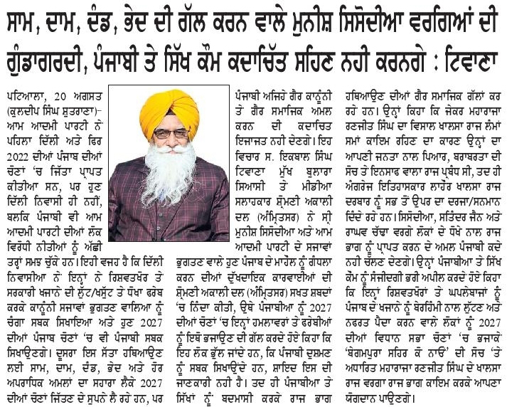 ਮੁਨੀਸ ਸਿੰਸੋਦੀਆ ਵਰਗੇ ਦਿੱਲੀ ਤੋ ਪੰਜਾਬ ਆਏ ਸਿਆਸਤਦਾਨਾਂ ਦੀ ਗੁੰਡਾਗਰਦੀ ਪੰਜਾਬੀ ਤੇ ਸਿੱਖ ਕੌਮ ਕਦਾਚਿੱਤ ਸਹਿਣ ਨਹੀ ਕਰਨਗੇ : ਟਿਵਾਣਾ ਫ਼ਤਹਿਗੜ੍ਹ ਸਾਹਿਬ, 20 ਅਗਸਤ ( ) “ਜੋ ਆਮ ਆਦਮੀ ਪਾਰਟੀ…