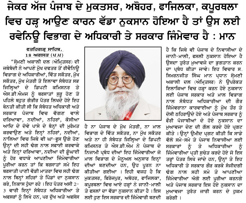 ਜੇਕਰ ਅੱਜ ਪੰਜਾਬ ਦੇ ਮੁਕਤਸਰ, ਅਬੋਹਰ, ਫਾਜਿਲਕਾ, ਕਪੂਰਥਲਾ ਵਿਚ ਹੜ੍ਹ ਆਉਣ ਕਾਰਨ ਵੱਡਾ ਨੁਕਸਾਨ ਹੋਇਆ ਹੈ, ਤਾਂ ਉਸ ਲਈ ਰਵੇਨਿਊ ਵਿਭਾਗ ਦੇ ਅਧਿਕਾਰੀ ਤੇ ਸਰਕਾਰ ਜਿੰਮੇਵਾਰ ਹੈ : ਮਾਨ ਫ਼ਤਹਿਗੜ੍ਹ…