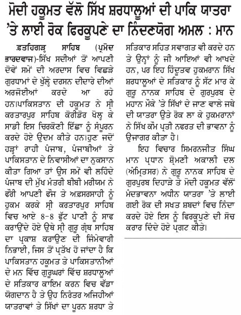ਸ੍ਰੀ ਕਰਤਾਰਪੁਰ ਸਾਹਿਬ ਕੋਰੀਡੋਰ ਮਾਮਲੇ ਵਿਚ ਕਾਂਗਰਸ ਅਤੇ ਬੀਜੇਪੀ ਦੀ ਸੋਚ ਵਿਚ ਅੰਤਰ ਕਿਉਂ ਹੈ ? : ਮਾਨ ਸੁਰੱਖਿਆ ਮੁੱਦੇ ਨਾਲੋ ਸਿੱਖ ਆਪਣੇ ਧਰਮ ਨੂੰ ਉੱਚ ਦਰਜਾ ਦਿੰਦੇ ਹਨ ਫ਼ਤਹਿਗੜ੍ਹ…
