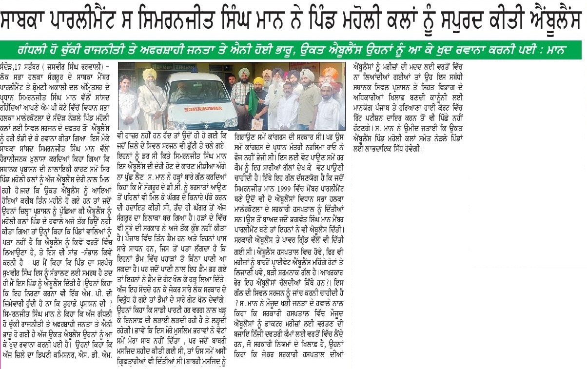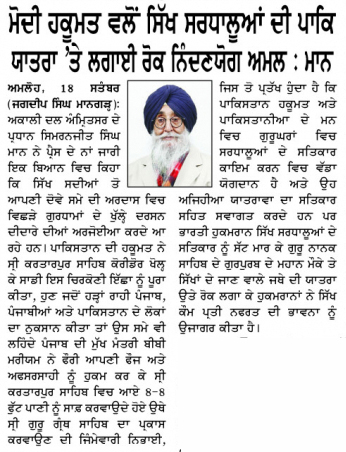 ਮੋਦੀ ਦੀ ਮੁਤੱਸਵੀ ਹਕੂਮਤ ਵੱਲੋ ਸਿੱਖ ਸਰਧਾਲੂਆਂ ਦੀ ਪਾਕਿ ਯਾਤਰਾ ਤੇ ਲਗਾਈ ਰੋਕ ਫਿਰਕੂਪਣੇ ਦਾ ਨਿੰਦਣਯੋਗ ਅਮਲ : ਮਾਨ ਫ਼ਤਹਿਗੜ੍ਹ ਸਾਹਿਬ, 16 ਸਤੰਬਰ ( ) “ਸਿੱਖ ਸਦੀਆਂ ਤੋ ਆਪਣੀ ਦੋਵੇ…