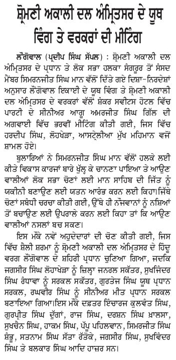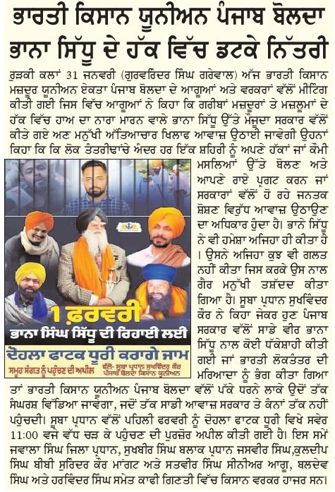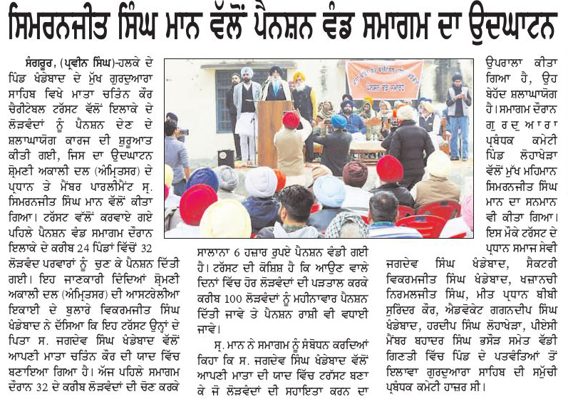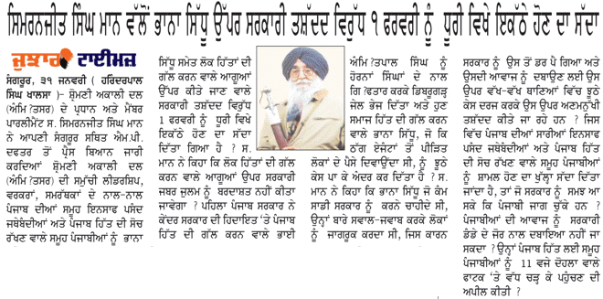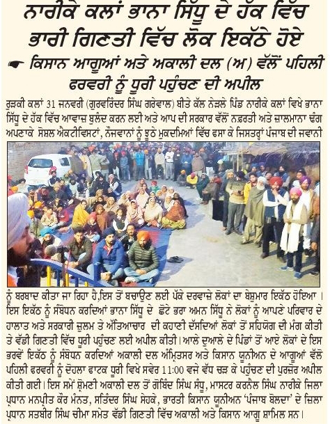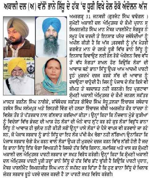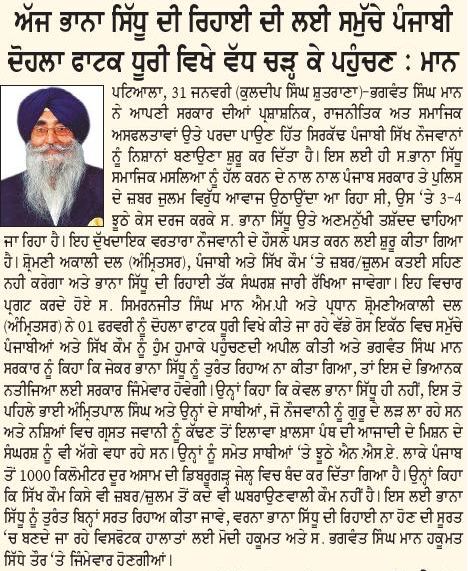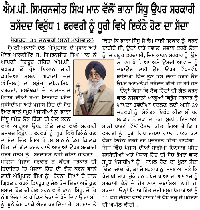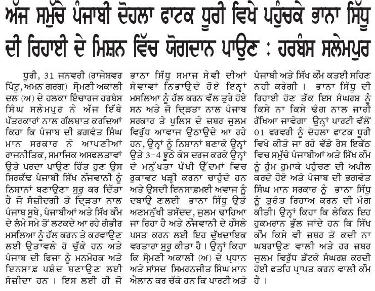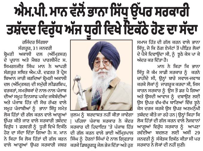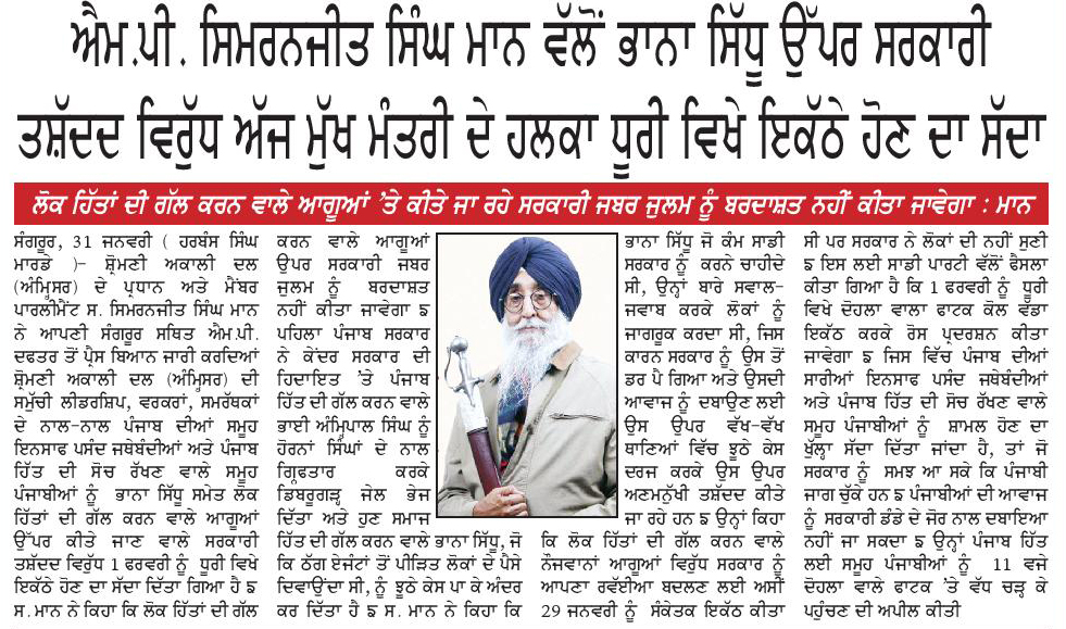 ਪਹਿਰੇਦਾਰ 01 February 2024 ਸੱਚ ਦੀ ਪਟਾਰੀ 01 February 2024 Post navigation ਸਿਮਰਨਜੀਤ ਸਿੰਘ ਮਾਨ ਵੱਲੋਂ ਲੋਕਾਂ ਨੂੰ ਭਾਨੇ ਸਿੱਧੂ ਦੇ ਹੱਕ ‘ਚ ਧੂਰੀ ਪਹੁੰਚਣ ਦੀ ਅਪੀਲ ਸਾਂਸਦ ਸਿਮਰਨਜੀਤ ਸਿੰਘ ਮਾਨ ਨੂੰ ਪੁਲਿਸ ਨੇ ਕੀਤਾ ਹਾਊਂਸ ਅਰੈਸਟ