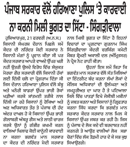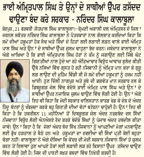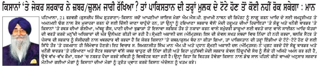 ਪਹਿਰੇਦਾਰ 22 February 2024 ਰੋਜ਼ਾਨਾ ਸਪੋਕਸਮੈਨ 22 February 2024 Post navigation ਸਿਮਰਨਜੀਤ ਸਿੰਘ ਮਾਨ ਨੇ ਮੰਗੀ ਧਨੌਲਾ ਪੁਲਿਸ ਮੁਕਾਬਲੇ ਦੀ ਜਾਂਚ ਮੈਨੂੰ ਡਿਬਰੂਗੜ੍ਹ ਜਾਣ ਤੋਂ ਰੋਕਿਆ ਤੇ ਅੰਮ੍ਰਿਤਸਰ ਜੇਲ੍ਹ ‘ਚ ਬੰਦ ਸਿੰਘਾਂ ਨੂੰ ਵੀ ਨਹੀ ਮਿਲਣ ਦਿੱਤਾ ਜਾ ਰਿਹਾ : ਮਾਨ
