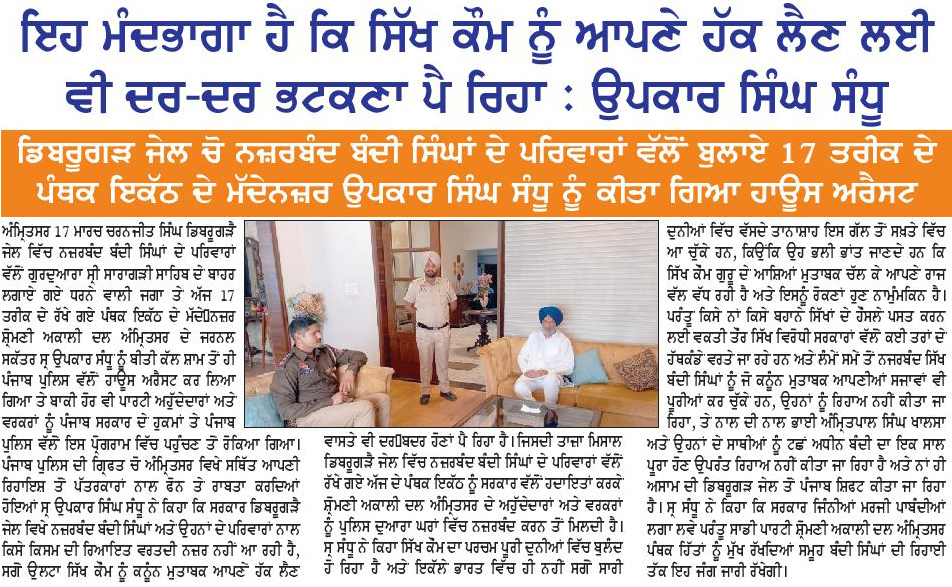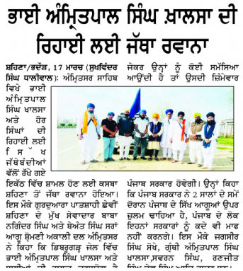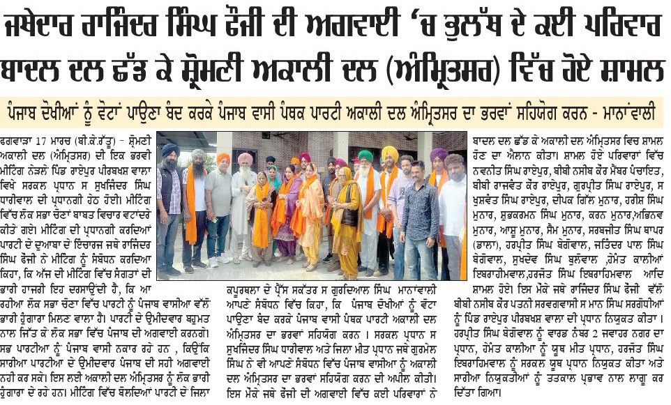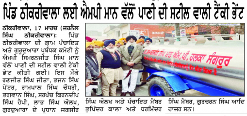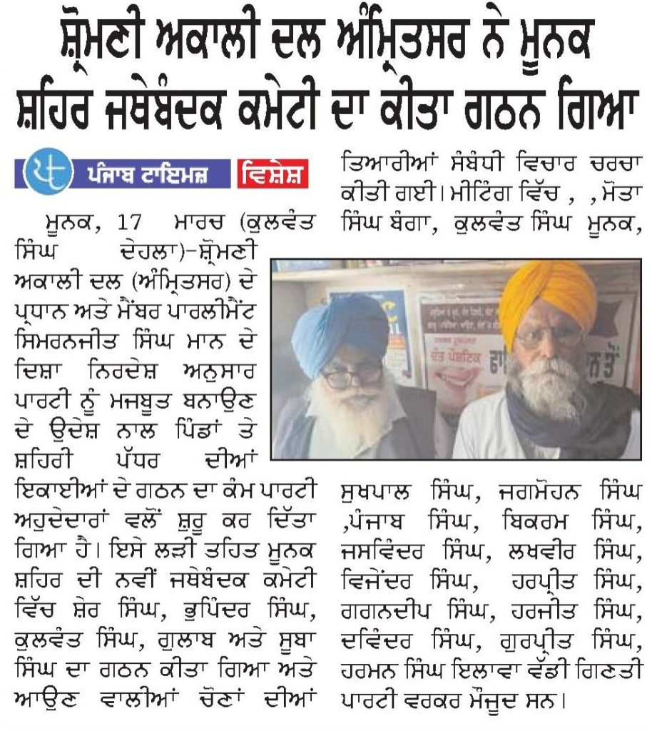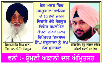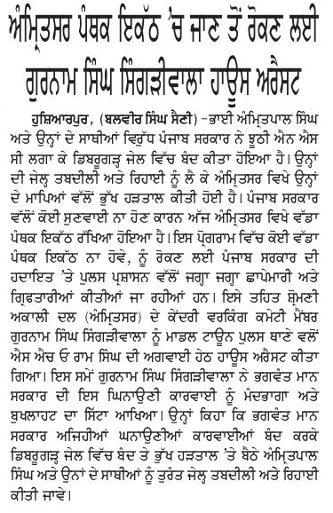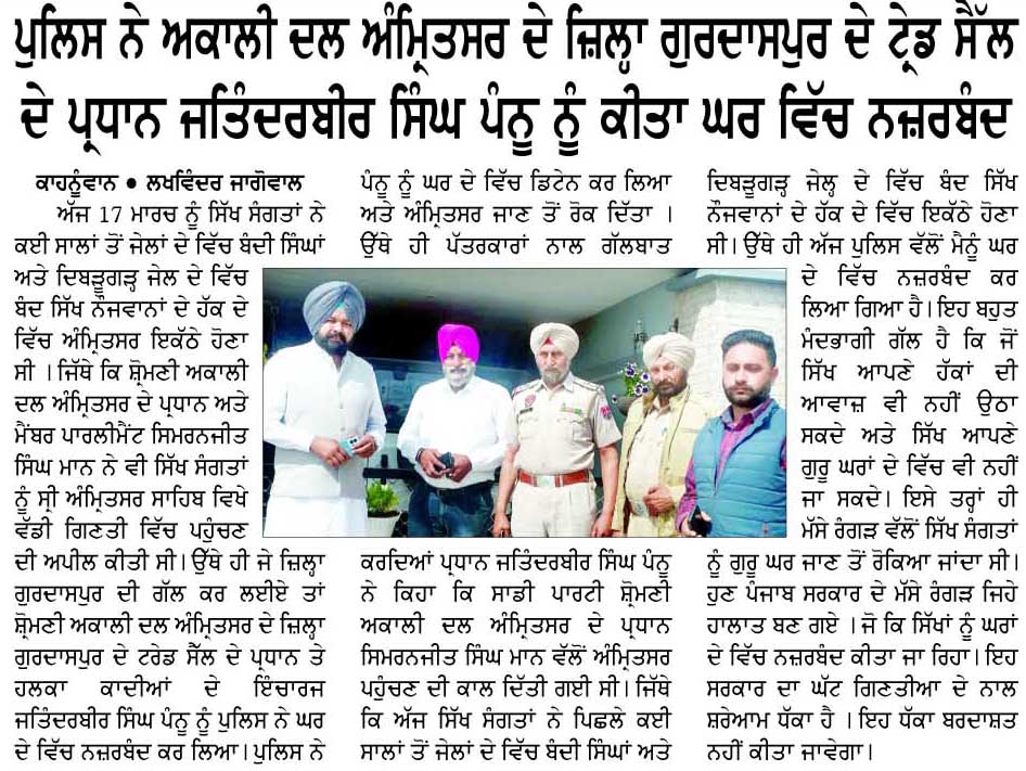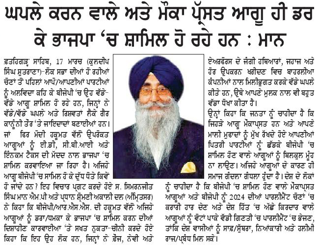ਪੰਜਾਬ ਟਾਈਮਜ 18 March 2024 ਪਹਿਰੇਦਾਰ 18 February 2024 ਰੋਜ਼ਾਨਾ ਸਪੋਕਸਮੈਨ 18 March 2024 Post navigation ਮਿਸਟਰ ਪੁਤਿਨ ਵੱਲੋ ਨਿਊਕਲਰ ਪਾਵਰ ਦੀ ਵਰਤੋਂ ਦੀ ਗੱਲ ਕਰਨਾ ਅਮਨ-ਚੈਨ ਤੇ ਮਨੁੱਖਤਾ ਲਈ ਵੱਡਾ ਖ਼ਤਰਾ : ਮਾਨ ਹੋਲੇ-ਮਹੱਲੇ ਤੇ ਸ਼੍ਰੋਮਣੀ ਅਕਾਲੀ ਦਲ (ਅੰਮ੍ਰਿਤਸਰ) ਸ੍ਰੀ ਆਨੰਦਪੁਰ ਸਾਹਿਬ ਵਿਖੇ 25 ਨੂੰ ਵਿਸ਼ਾਲ ਕਾਨਫਰੰਸ ਕਰੇਗਾ : ਮਾਨ