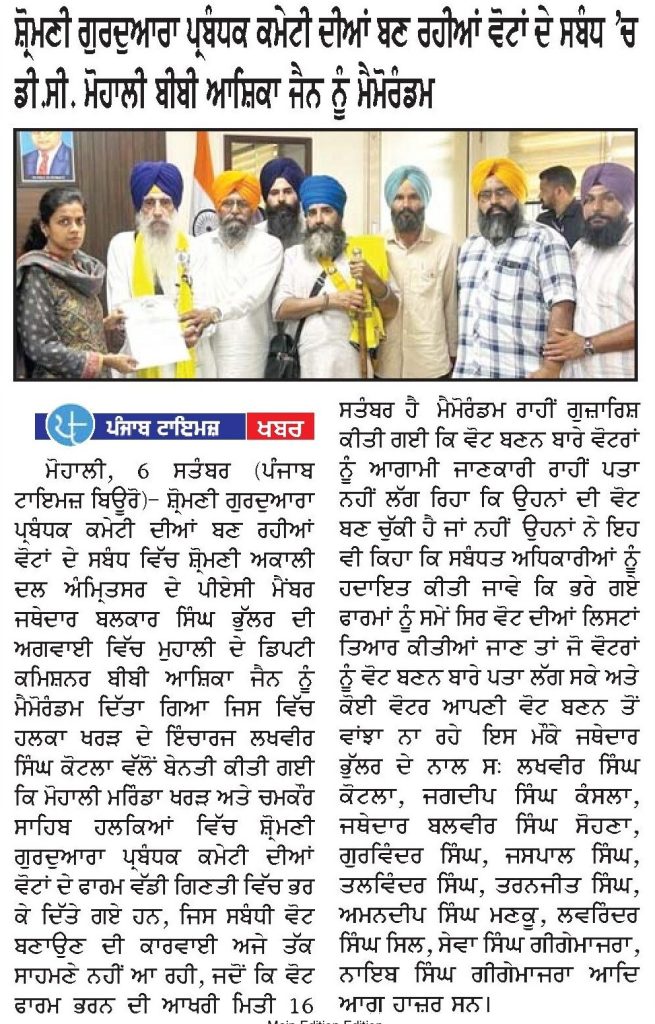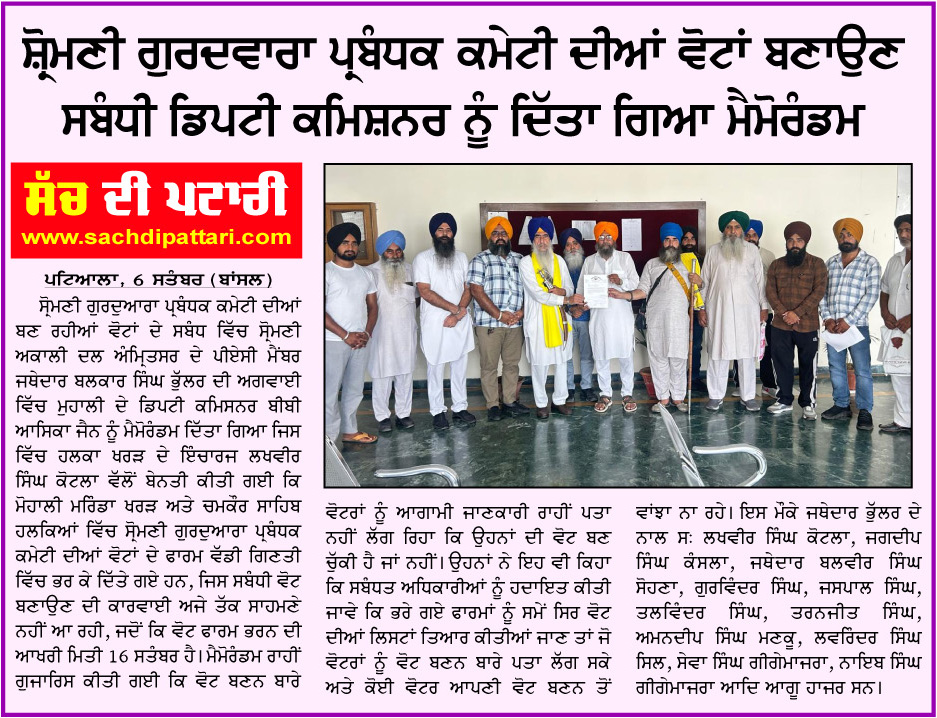 ਪਹਿਰੇਦਾਰ 07 September 2024 ਸੱਚ ਦੀ ਪਟਾਰੀ 07 September 2024 Post navigation ਅੰਨਦਾਤਾ ਕਿਸਾਨ ਨੂੰ ਬਲਾਤਕਾਰੀ ਕਹਿਣਾ, ਕਿਸਾਨਾਂ ਨਾਲ ਵੱਡੀ ਬੇਇਨਸਾਫ਼ੀ ਤੇ ਜ਼ਬਰ : ਮਾਨ ਗਿਆਨੀ ਦਿੱਤ ਸਿੰਘ ਦੀ ਯਾਦ ‘ਚ 123ਵਾਂ ਬਰਸੀ ਸਮਾਗਮ