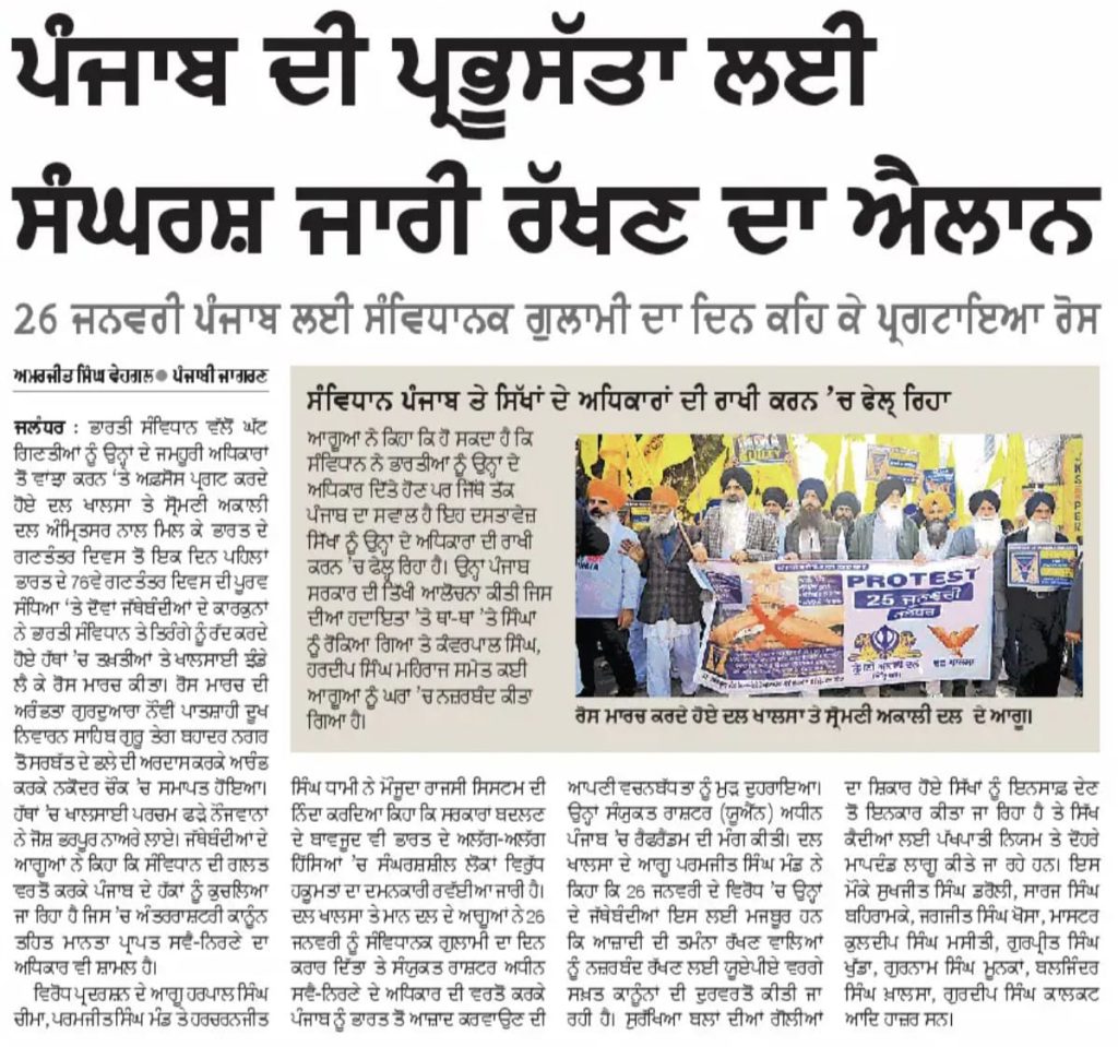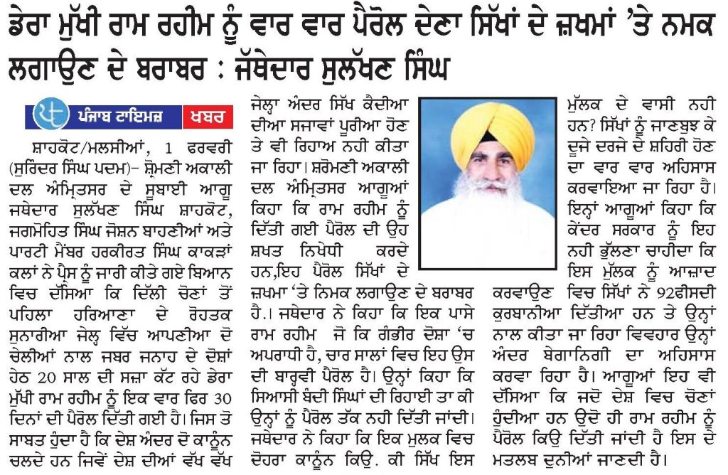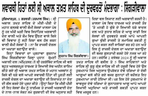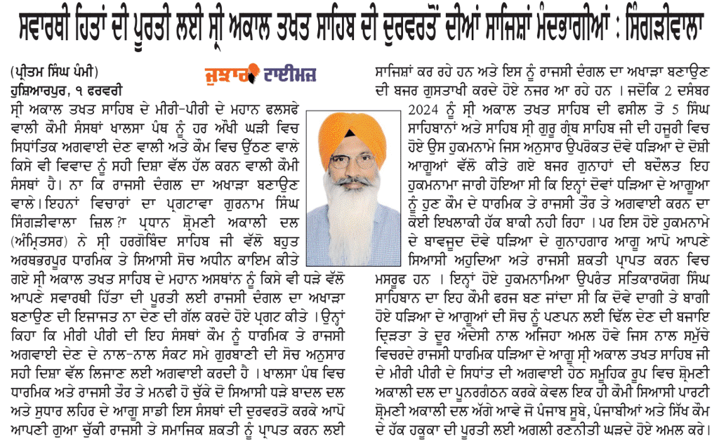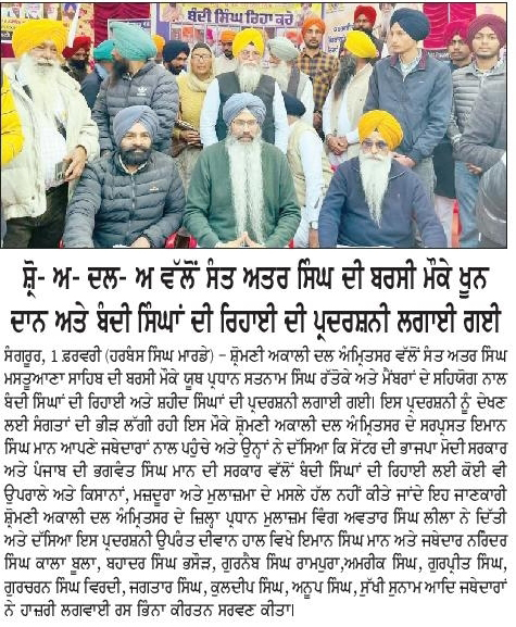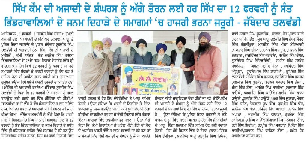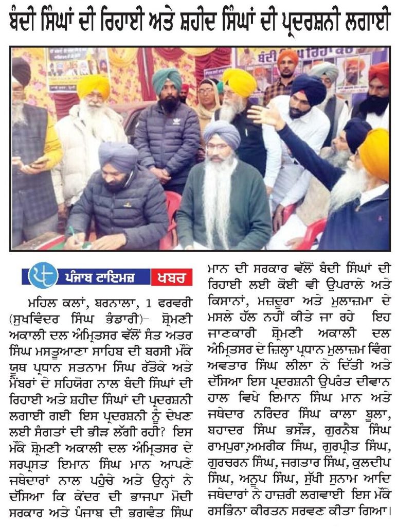 ਪੰਜਾਬ ਟਾਈਮਜ 02 February 2025 ਪਹਿਰੇਦਾਰ 02 February 2025 ਰੋਜ਼ਾਨਾ ਸਪੋਕਸਮੈਨ 02 February 2025 Post navigation ਸ੍ਰੀ ਅਕਾਲ ਤਖ਼ਤ ਸਾਹਿਬ ਦੀ ਸੰਸਥਾਂ ਨੂੰ ‘ਰਾਜਸੀ ਦੰਗਲ ਦਾ ਅਖਾੜਾ’ ਬਣਾਉਣ ਦੀ ਇਜਾਜਤ ਨਾ ਦਿੱਤੀ ਜਾਵੇ : ਟਿਵਾਣਾ ਬੰਦੀ ਸਿੰਘਾਂ ਦੀ ਰਿਹਾਈ ਤੇ ਸ਼ਹੀਦ ਸਿੰਘਾਂ ਦੀ ਪ੍ਰਦਰਸ਼ਨੀ ਲਗਾਈ