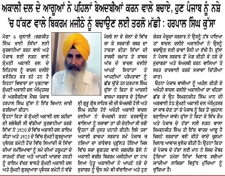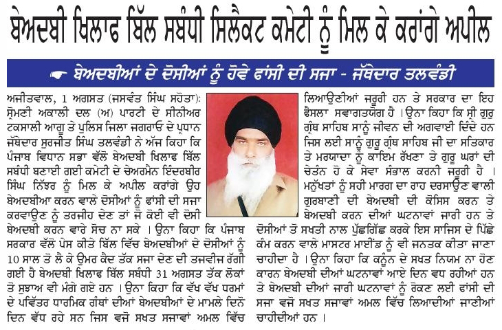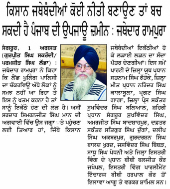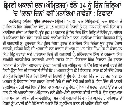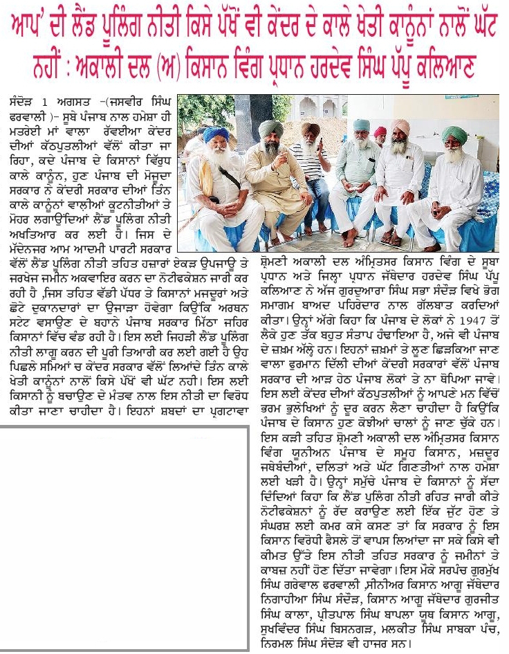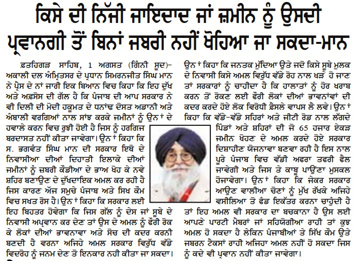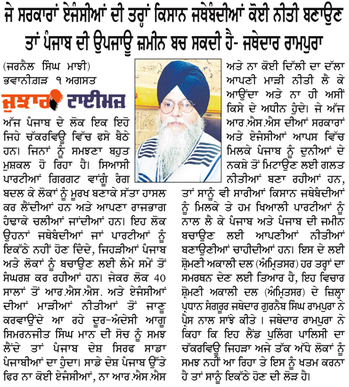 ਪਹਿਰੇਦਾਰ 02 August 2025 ਰੋਜ਼ਾਨਾ ਸਪੋਕਸਮੈਨ 02 August 2025 Post navigation ਸ਼੍ਰੋਮਣੀ ਅਕਾਲੀ ਦਲ (ਅੰਮ੍ਰਿਤਸਰ) ਵੱਲੋਂ ਸ਼ਹੀਦ ਊਧਮ ਸਿੰਘ ਨੂੰ ਸ਼ਰਧਾਂਜਲੀ, ਸਰਕਾਰਾਂ ਨੂੰ ਨੌਜਵਾਨਾਂ ਲਈ ਰੁਜ਼ਗਾਰ ਦੀ ਮੰਗ ਸ਼੍ਰੋਮਣੀ ਅਕਾਲੀ ਦਲ (ਅੰਮ੍ਰਿਤਸਰ) ਵੱਲੋਂ 14 ਅਗਸਤ ਨੂੰ ਤਿੰਨ ਜਿ਼ਲ੍ਹਿਆਂ ਵਿਚ ‘ਕਾਲਾ ਦਿਨ’ ਵੱਜੋ ਮਨਾਇਆ ਜਾਵੇਗਾ : ਟਿਵਾਣਾ