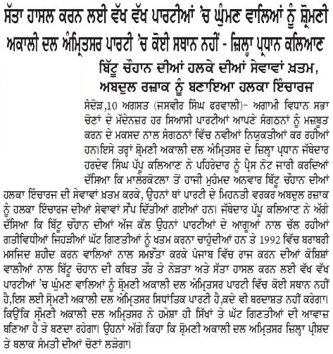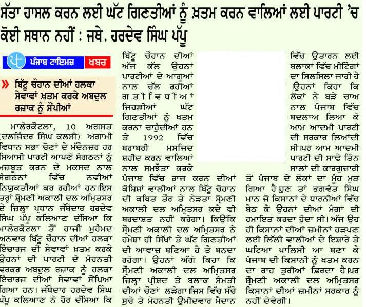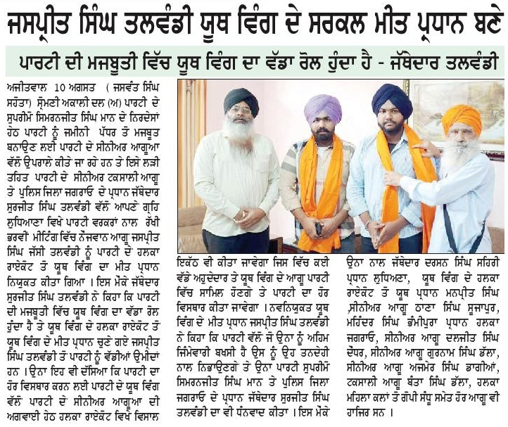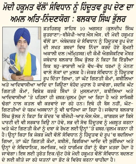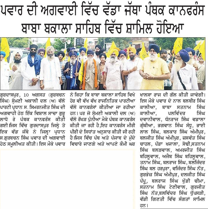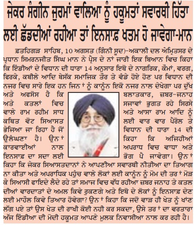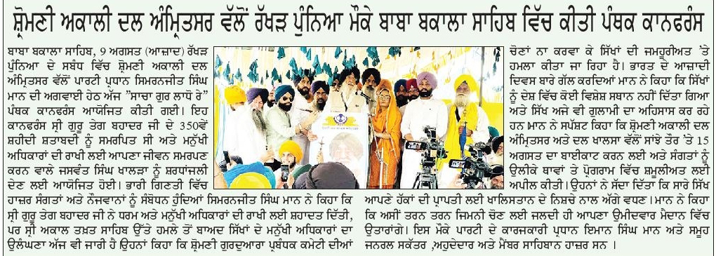 ਪਹਿਰੇਦਾਰ 11 August 2025 Post navigation ਸ਼੍ਰੋਮਣੀ ਅਕਾਲੀ ਦਲ (ਅੰਮ੍ਰਿਤਸਰ) ਵੱਲੋਂ ਰੱਖੜ ਪੁੰਨਿਆਂ ਮੌਕੇ ਬਾਬਾ ਬਕਾਲਾ ਸਾਹਿਬ ਵਿਖੇ ਕੀਤੀ ਪੰਥਕ ਕਾਨਫਰੰਸ ਸੰਗਰੂਰ ਜੇਲ੍ਹ ਵਿਚ ਬੰਦੀ ਸ. ਗੁਰਵਿੰਦਰ ਸਿੰਘ ਨੌਸ਼ਹਿਰਾਂ ਪੰਨੂਆਂ ਨੂੰ ਤਸੱਦਦ ਕਰਕੇ ਮਾਰ ਦੇਣ ਅਤੇ ਹੋਰ ਝੂਠੇ ਮੁਕਾਬਲਿਆ ਵਿਚ ਹੋਈਆਂ ਮੌਤਾਂ ਦੀ ਫੌਰੀ ਜਾਂਚ ਹੋਵੇ : ਮਾਨ
