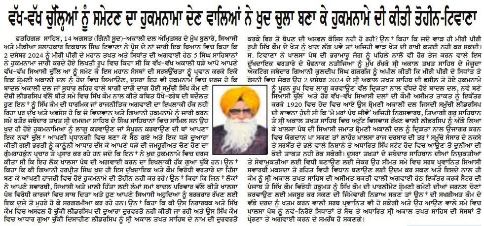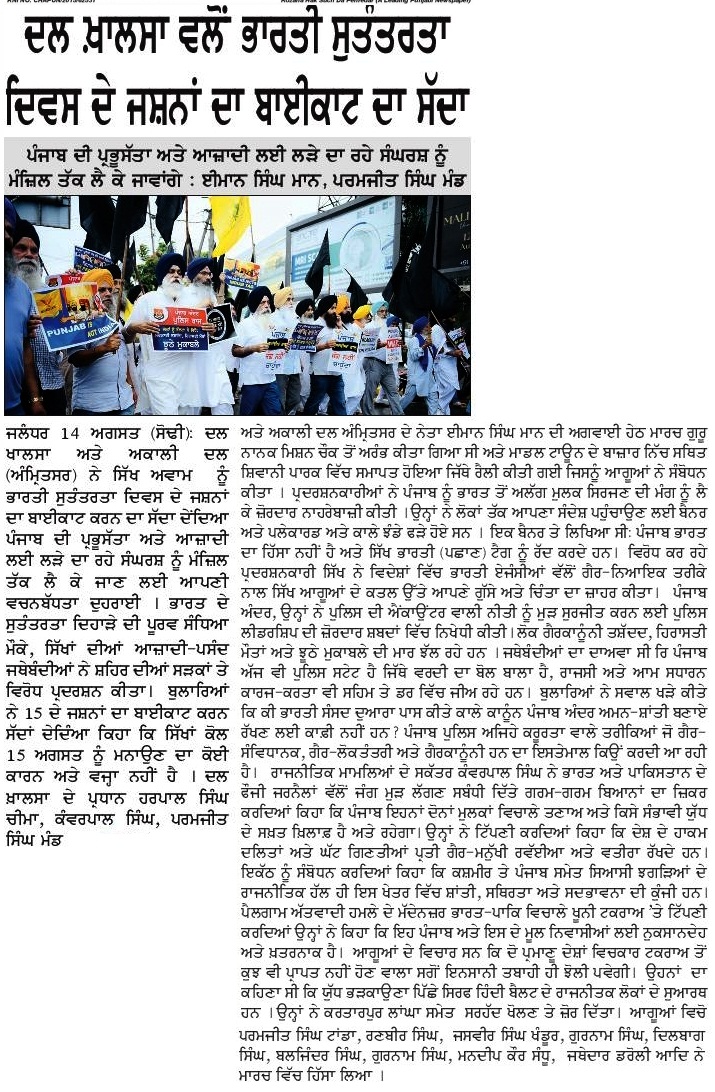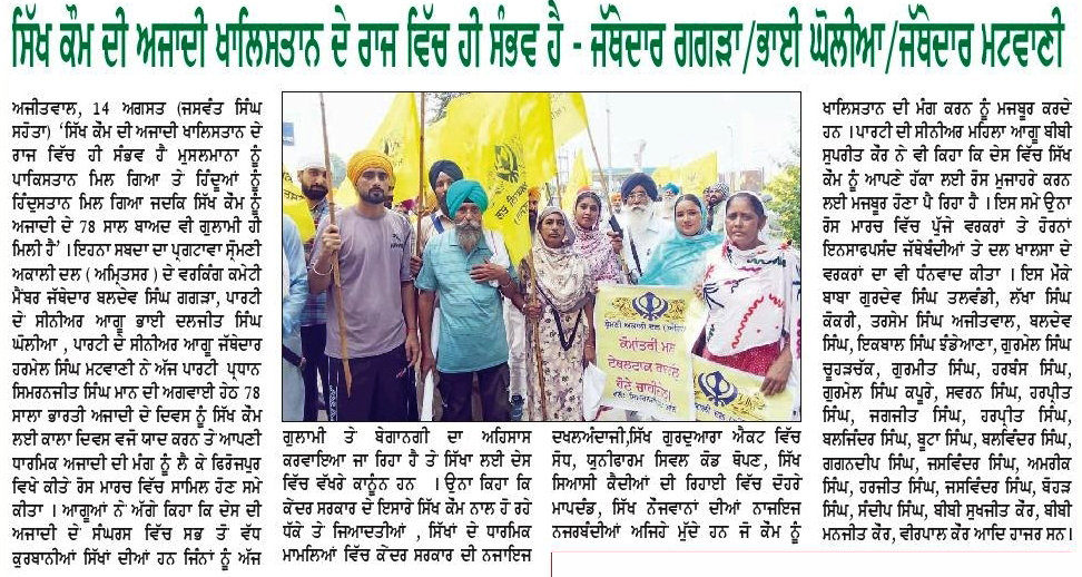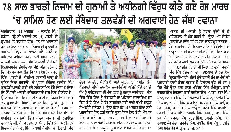 ਪਹਿਰੇਦਾਰ 15 August 2025 ਰੋਜ਼ਾਨਾ ਸਪੋਕਸਮੈਨ 15 August 2025 Post navigation ਲੈਡ ਪੂਲਿੰਗ ਦੀ ਪਾਲਸੀ ਪੰਜਾਬ ਸਰਕਾਰ ਵੱਲੋਂ ਪ੍ਰਵਾਸੀਆਂ ਨੂੰ ਵਸਾਉਣ ਦੀ ਮੰਦਭਾਵਨਾ ਸੀ : ਮਾਨ ਸ਼੍ਰੋਮਣੀ ਅਕਾਲੀ ਦਲ (ਅੰਮ੍ਰਿਤਸਰ) ਅਤੇ ਦਲ ਖਾਲਸਾ ਵੱਲੋ 14 ਅਗਸਤ ਨੂੰ ਕੀਤੇ ਗਏ ਰੋਸ ਮੁਜਾਹਰਿਆ ਨੇ ਕੌਮਾਂਤਰੀ ਪੱਧਰ ਤੇ ਸਹੀ ਸੰਦੇਸ਼ ਦਿੱਤਾ : ਮਾਨ