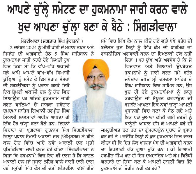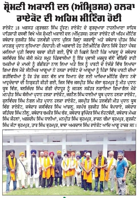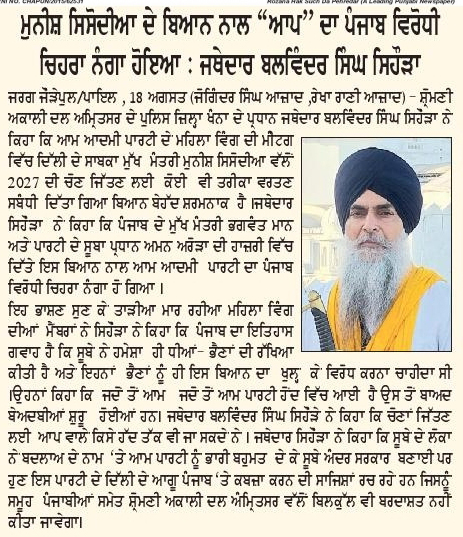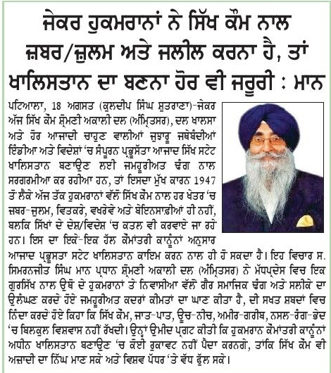 ਪਹਿਰੇਦਾਰ 19 August 2025 ਸੱਚ ਦੀ ਪਟਾਰੀ 15 August 2025 Post navigation ਸਿੱਖ ਫ਼ੌਜ ਦੀ ਦੇਸ਼ ਦੇ ਅੰਦਰ ਘਰੇਲੂ ਜੰਗ ਦੌਰਾਨ ਵਰਤੋਂ ਕਰਨ ਨਾਲ ਦੂਜੇ ਵਰਗਾਂ ‘ਚ ਸਿੱਖ ਕੌਮ ਪ੍ਰਤੀ ਨਫਰਤ ਫੈਲਦੀ ਹੈ : ਮਾਨ ਕੋਈ ਵੀ ਕੌਮ, ਬਿਨ੍ਹਾਂ ਕਿਸੇ ਸਿਧਾਂਤ, ਸੋਚ ਅਤੇ ਨਿਸ਼ਾਨੇ ਤੋ ਬਿਨ੍ਹਾਂ ਆਪਣੀ ਮੰਜਿਲ ਤੇ ਕਦਾਚਿੱਤ ਨਹੀ ਪਹੁੰਚ ਸਕਦੀ : ਮਾਨ