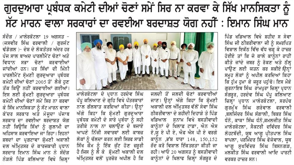 ਪਹਿਰੇਦਾਰ 20 August 2025 Post navigation ਜੇਕਰ ਅੱਜ ਪੰਜਾਬ ਦੇ ਮੁਕਤਸਰ, ਅਬੋਹਰ, ਫਾਜਿਲਕਾ, ਕਪੂਰਥਲਾ ਵਿਚ ਹੜ੍ਹ ਆਉਣ ਕਾਰਨ ਵੱਡਾ ਨੁਕਸਾਨ ਹੋਇਆ ਹੈ, ਤਾਂ ਉਸ ਲਈ ਰਵੇਨਿਊ ਵਿਭਾਗ ਦੇ ਅਧਿਕਾਰੀ ਤੇ ਸਰਕਾਰ ਜਿੰਮੇਵਾਰ ਹੈ : ਮਾਨ ਪਿੰਡ ਖੜਿਆਲ ‘ਚ ਸ਼੍ਰੋਮਣੀ ਅਕਾਲੀ ਦਲ (ਅੰਮ੍ਰਿਤਸਰ) ਦੀ ਹੋਈ ਕਾਨਫਰੰਸ