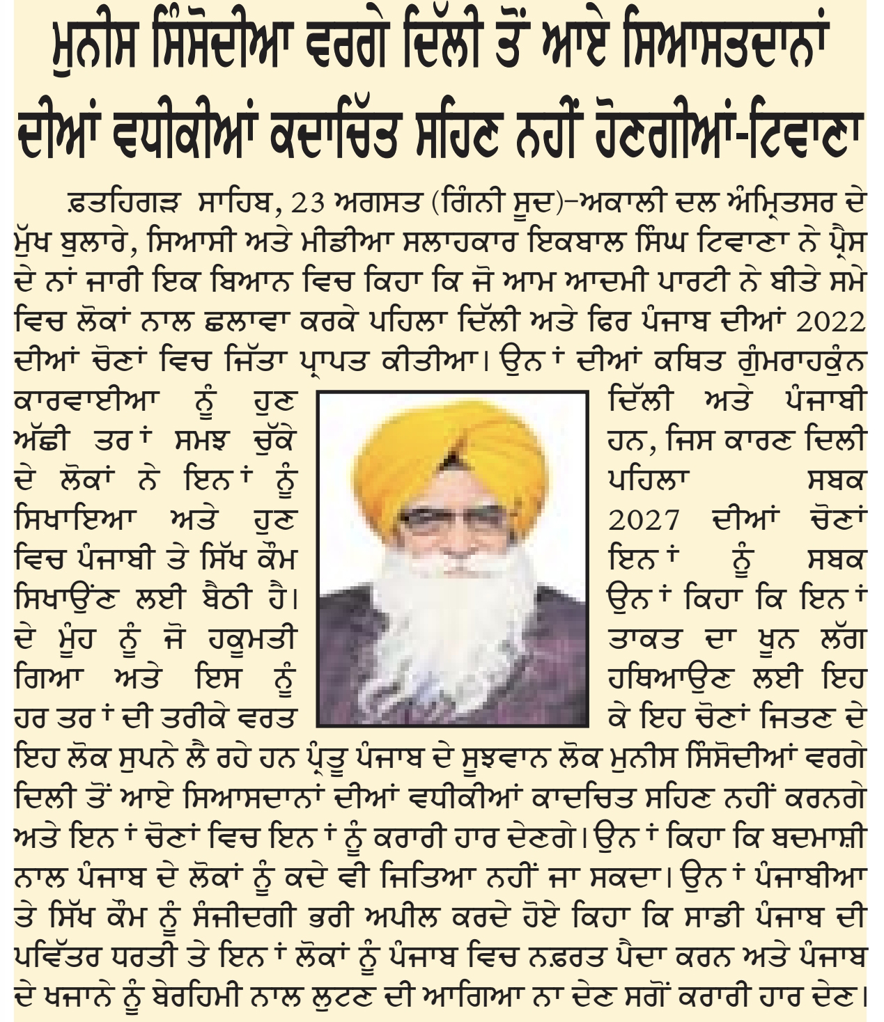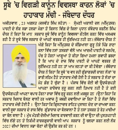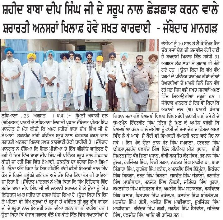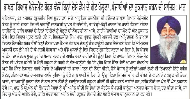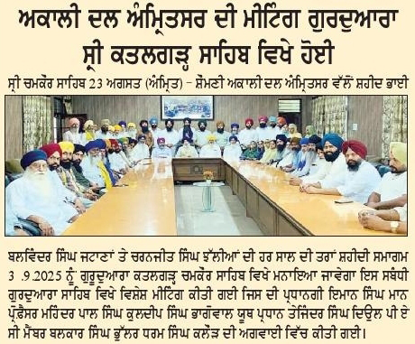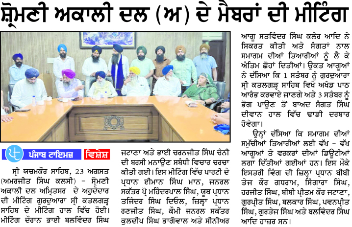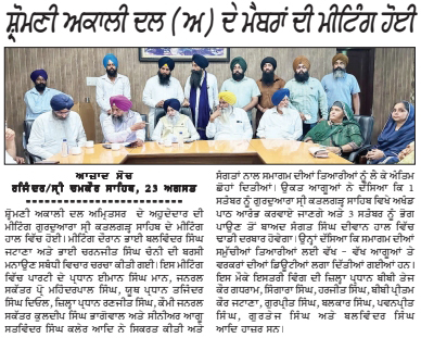 ਪਹਿਰੇਦਾਰ 24 August 2025 ਸੱਚ ਦੀ ਪਟਾਰੀ 24 August 2025 Post navigation ਪੰਜਾਬ ਸਰਕਾਰ ਦੀ ਪ੍ਰਵਾਨਗੀ ਤੋ ਬਗੈਰ ਭਾਖੜਾ ਬਿਆਸ ਮੈਨੇਜਮੈਟ ਬੋਰਡ ਦੇ ਗੇਟ ਖੋਲਣਾ ਨਿੰਦਣਯੋਗ : ਮਾਨ ਸ਼ਹੀਦੀ ਸਮਾਗਮ ਨੂੰ ਲੈਕੇ ਸ਼੍ਰੋਮਣੀ ਅਕਾਲੀ ਦਲ (ਅੰਮ੍ਰਿਤਸਰ) ਵੱਲੋ ਕੀਤੀ ਗਈ ਮੀਟਿੰਗ