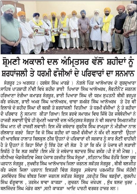 ਪਹਿਰੇਦਾਰ 30 August 2025 Post navigation ਸੁਪਰੀਮ ਕੋਰਟ ਵੱਲੋਂ ਹਿੰਦੂਤਵ ਸੋਚ ਦੇ ਹੱਕ ‘ਚ ਭੁਗਤਣਾ, ਇਨਸਾਫ਼ ਦੇ ਨਾਂਅ ਤੇ ਵੱਡਾ ਕਲੰਕ : ਮਾਨ ਬੀਬੀ ਸਤਵੰਤ ਕੌਰ ਸਪੁੱਤਰੀ ਸ਼ਹੀਦ ਭਾਈ ਅਮਰੀਕ ਸਿੰਘ ਨੇ ਗਦਾਰਾਂ ਦੀ ਬਰਸੀਂ ਉਤੇ ਨਾ ਜਾ ਕੇ ਆਪਣੇ ਪਿਤਾ ਦੀ ਸੋਚ ਉਤੇ ਪਹਿਰਾ ਦਿੱਤਾ : ਟਿਵਾਣਾ