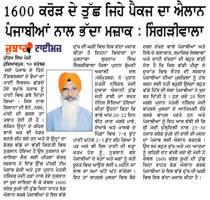 ਪਹਿਰੇਦਾਰ 11 September 2025 Post navigation ਹੜ੍ਹ ਪ੍ਰਭਾਵਿਤ ਕਿਸਾਨਾਂ ਨੂੰ 75 ਹਜਾਰ ਪ੍ਰਤੀ ਏਕੜ ਮੁਆਵਜਾ ਦਿੱਤਾ ਜਾਵੇ : ਮਾਨ ਪਿੰਡ ਜੌਹਲਾਂ ਵਿਖੇ ਸ਼ਹੀਦ ਭਾਈ ਸਰਬਜੀਤ ਸਿੰਘ ਜੌਹਲ ਦੀ ਬਰਸੀਂ ‘ਤੇ ਹੋਇਆ ਗੁਰਮਿਤ ਸਮਾਗਮ