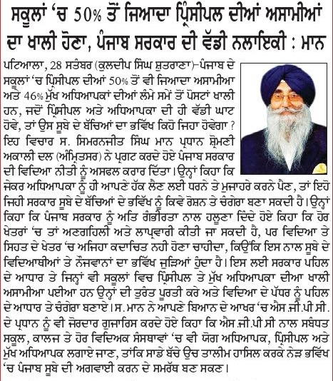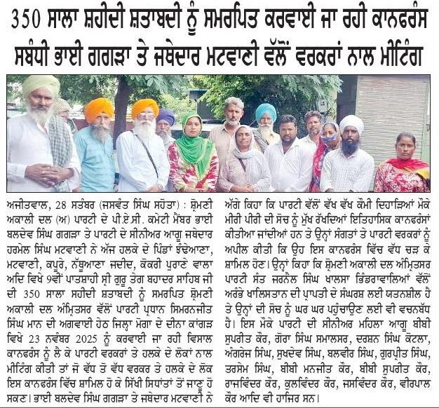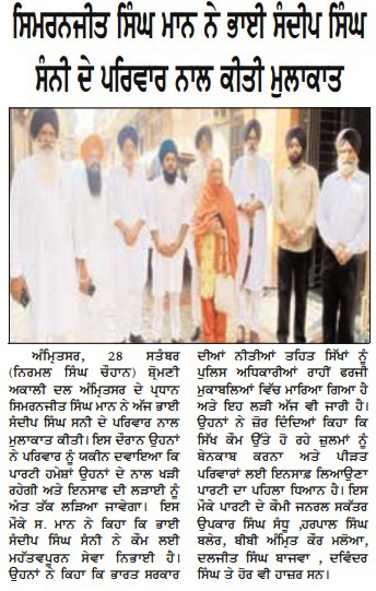 ਪਹਿਰੇਦਾਰ 29 September 2025 Post navigation ਸਿਮਰਨਜੀਤ ਸਿੰਘ ਮਾਨ ਵੱਲੋਂ ਭਾਈ ਸੰਦੀਪ ਸਿੰਘ ਸੰਨੀ ਦੇ ਪਰਿਵਾਰ ਨਾਲ ਮੁਲਾਕਾਤ ਸ਼੍ਰੋਮਣੀ ਅਕਾਲੀ ਦਲ (ਅੰਮ੍ਰਿਤਸਰ) ਵੱਲੋਂ 350 ਸਾਲਾਂ ਸਤਾਬਦੀ ਮਨਾਉਣ ਲਈ ਕੀਤੀਆ ਵਿਚਾਰਾਂ