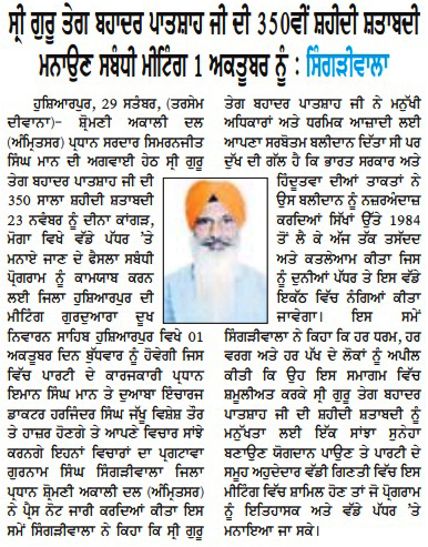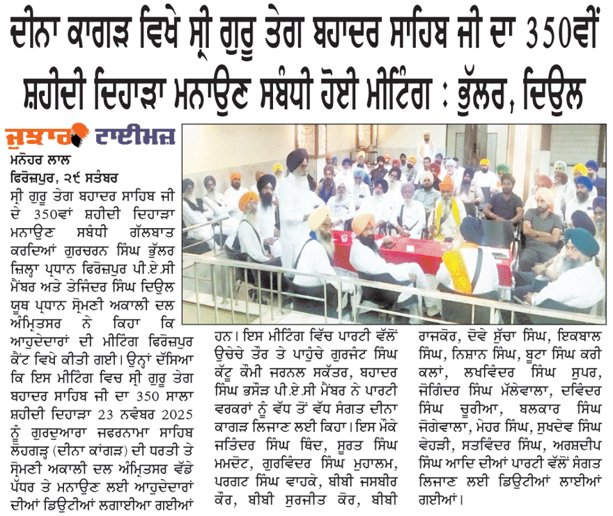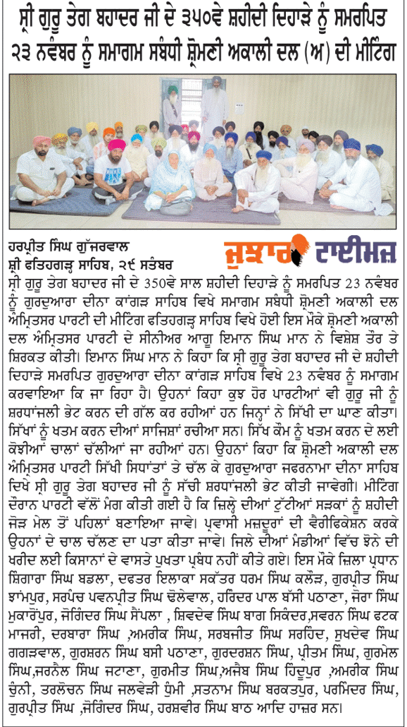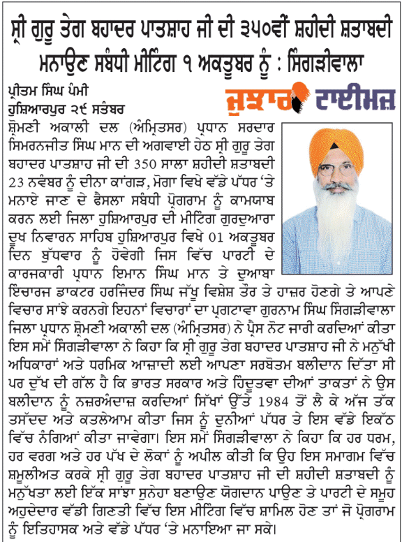 ਪਹਿਰੇਦਾਰ 30 September 2025 Post navigation ਸਰਕਾਰ ਮੁੱਖ ਅਧਿਆਪਕਾਂ ਦੀਆਂ ਅਸਾਮੀਆਂ ਭਰੇ : ਸਿਮਰਨਜੀਤ ਸਿੰਘ ਮਾਨ ਸ੍ਰੀ ਗੁਰੂ ਤੇਗ ਬਹਾਦਰ ਸਾਹਿਬ ਜੀ ਦੇ 350 ਸਾਲਾਂ ਸ਼ਹੀਦੀ ਦਿਹਾੜੇ ਸੰਬੰਧੀ ਸ਼੍ਰੋਮਣੀ ਅਕਾਲੀ ਦਲ (ਅੰਮ੍ਰਿਤਸਰ) ਜਿ਼ਲ੍ਹਾ ਗੁਰਦਾਸਪੁਰ ਵਿਚ ਮੀਟਿੰਗ ਹੋਈ