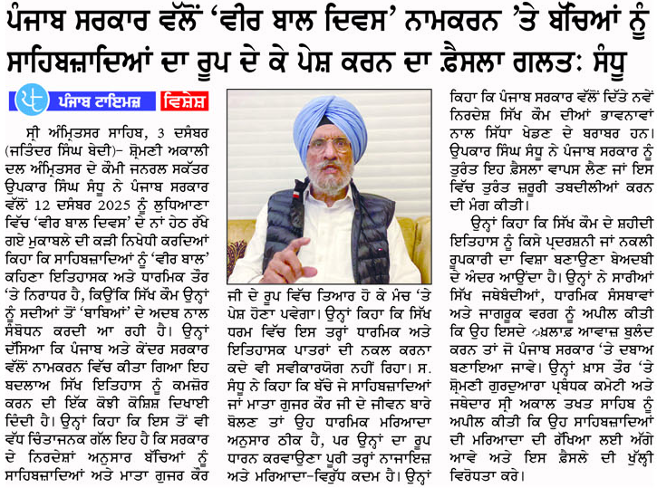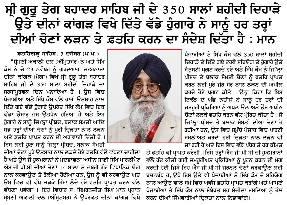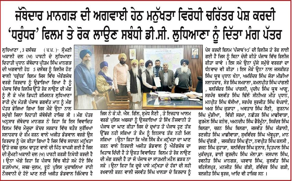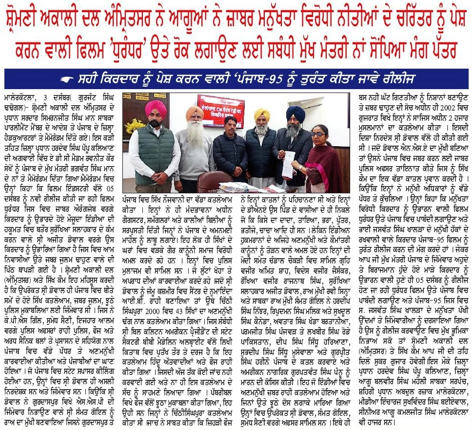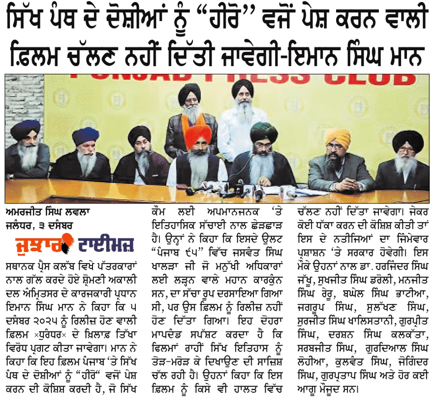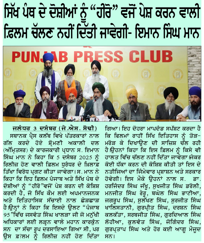 ਪਹਿਰੇਦਾਰ 04 December 2025 ਸੱਚ ਦੀ ਪਟਾਰੀ 04 December 2025 ਰੋਜ਼ਾਨਾ ਸਪੋਕਸਮੈਨ 04 December 2025 Post navigation ਸਿੱਖ ਪੰਥ ਦੇ ਦੋਸ਼ੀਆਂ ਨੂੰ ‘ਹੀਰੋ’ ਵੱਜੋਂ ਪੇਸ਼ ਕਰਨ ਵਾਲੀ ਫਿ਼ਲਮ ਚੱਲਣ ਨਹੀਂ ਦਿੱਤੀ ਜਾਵੇਗੀ : ਇਮਾਨ ਸਿੰਘ ਮਾਨ ਬਸੀ ਪਠਾਣਾ ਬਾਈਪਾਸ ‘ਤੇ ਕੂੜੇ ਦੇ ਡੰਪ ਬਣਾਉਣ ਦਾ ਅਮਲ ਤੁਰੰਤ ਰੋਕਿਆ ਜਾਵੇ : ਮਾਨ