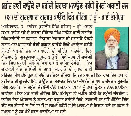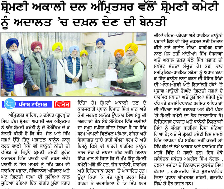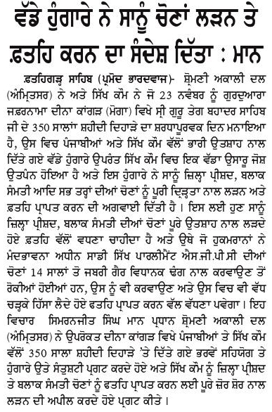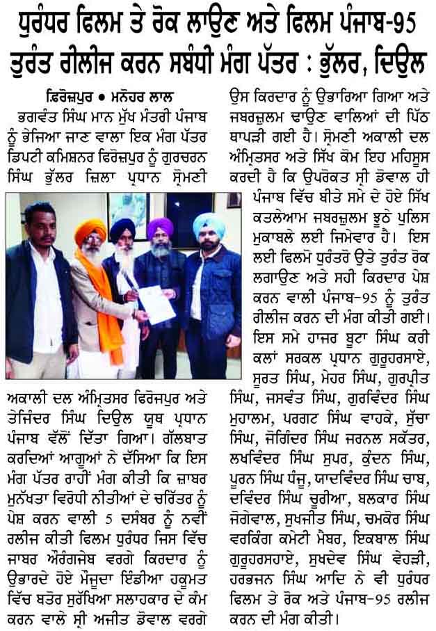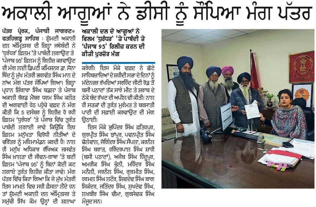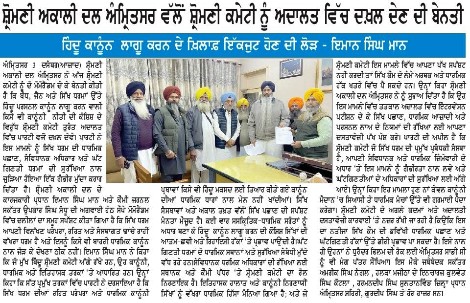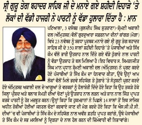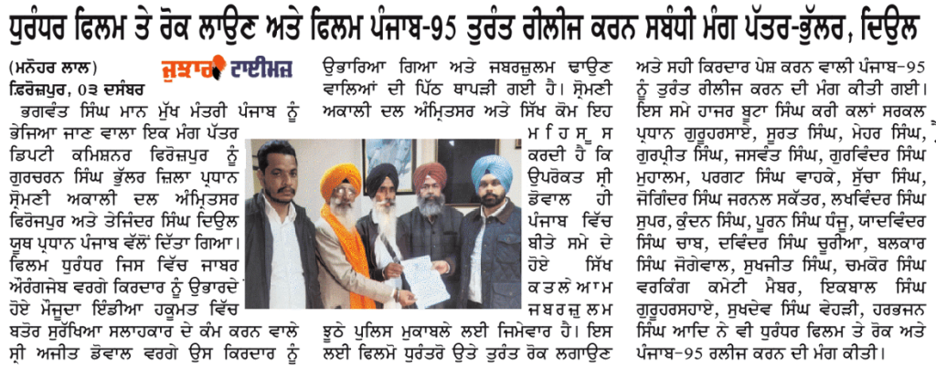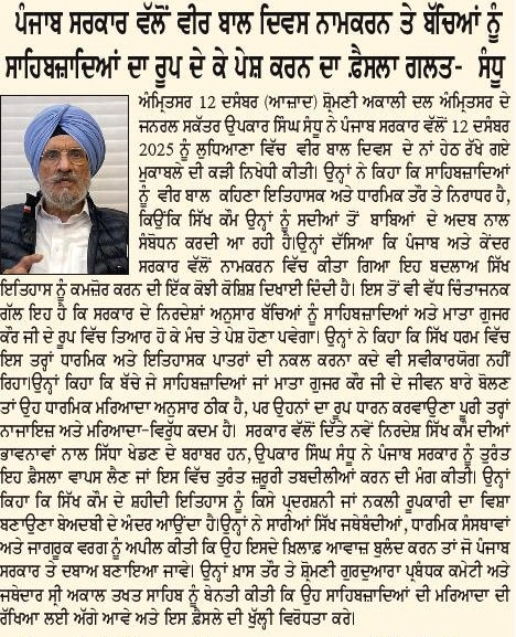 ਪਹਿਰੇਦਾਰ 04 December 2025 ਸੱਚ ਦੀ ਪਟਾਰੀ 04 December 2025 ਰੋਜ਼ਾਨਾ ਸਪੋਕਸਮੈਨ 04 December 2025 Post navigation ਸਿੱਖ ਪੰਥ ਦੇ ਦੋਸ਼ੀਆਂ ਨੂੰ ‘ਹੀਰੋ’ ਵੱਜੋਂ ਪੇਸ਼ ਕਰਨ ਵਾਲੀ ਫਿ਼ਲਮ ਚੱਲਣ ਨਹੀਂ ਦਿੱਤੀ ਜਾਵੇਗੀ : ਇਮਾਨ ਸਿੰਘ ਮਾਨ ਬਸੀ ਪਠਾਣਾ ਬਾਈਪਾਸ ‘ਤੇ ਕੂੜੇ ਦੇ ਡੰਪ ਬਣਾਉਣ ਦਾ ਅਮਲ ਤੁਰੰਤ ਰੋਕਿਆ ਜਾਵੇ : ਮਾਨ