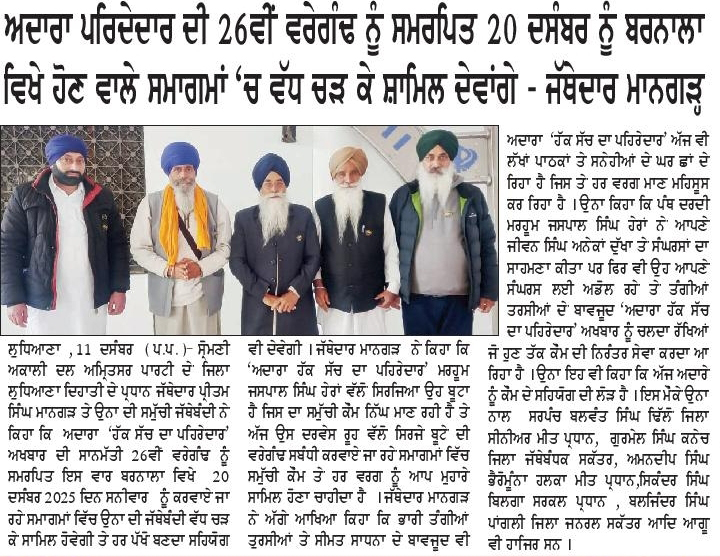 ਪਹਿਰੇਦਾਰ 12 December 2025 Post navigation ਸਾਹਿਬਜ਼ਾਦਿਆ ਦੀ ਸ਼ਹਾਦਤ ਨੂੰ ‘ਵੀਰ ਬਾਲ ਦਿਵਸ’ ਦਾ ਨਾਮ ਦੇ ਕੇ ਮੁਤੱਸਵੀ ਹੁਕਮਰਾਨਾਂ ਵੱਲੋਂ ਸਿੱਖਾਂ ਦੇ ਇਤਿਹਾਸ ਦਾ ਹਿੰਦੂਕਰਨ ਕਰਨਾ ਬਰਦਾਸਤ ਨਹੀ : ਟਿਵਾਣਾ ਸਿਮਰਨਜੀਤ ਸਿੰਘ ਮਾਨ ਤੇ ਪਾਰਟੀ ਨੇ ਗਹਿਰੇ ਦੁੱਖ ਦਾ ਪ੍ਰਗਟਾਵਾ ਕੀਤਾ