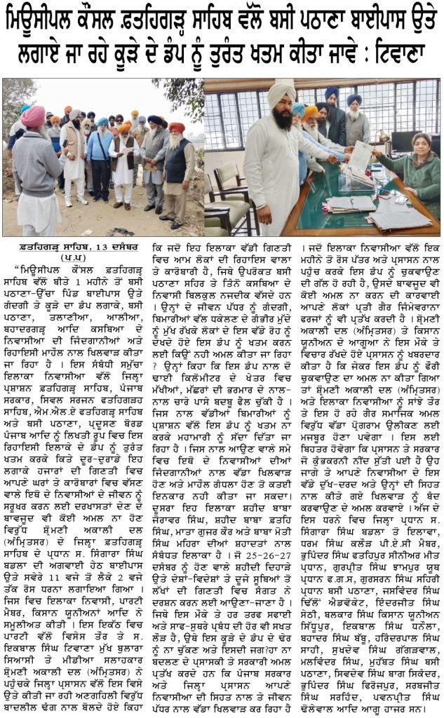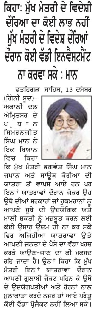 ਪਹਿਰੇਦਾਰ 14 December 2025 ਸੱਚ ਦੀ ਪਟਾਰੀ 14 December 2025 Post navigation ਸਿਮਰਨਜੀਤ ਸਿੰਘ ਮਾਨ ਤੇ ਪਾਰਟੀ ਨੇ ਗਹਿਰੇ ਦੁੱਖ ਦਾ ਪ੍ਰਗਟਾਵਾ ਕੀਤਾ ਸਾਹਿਬਜ਼ਾਦਿਆ ਦੀ ਸ਼ਹਾਦਤ ਨੂੰ ‘ਵੀਰ ਬਾਲ ਦਿਵਸ’ ਦਾ ਨਾਮ ਦੇ ਕੇ ਮੁਤੱਸਵੀ ਹੁਕਮਰਾਨਾਂ ਵੱਲੋਂ ਸਿੱਖ ਕੌਮ ਦੇ ਫਖ਼ਰ ਵਾਲੇ ਇਤਿਹਾਸ ਦਾ ਹਿੰਦੂਕਰਨ ਕਰਨਾ ਅਸਹਿ : ਟਿਵਾਣਾ