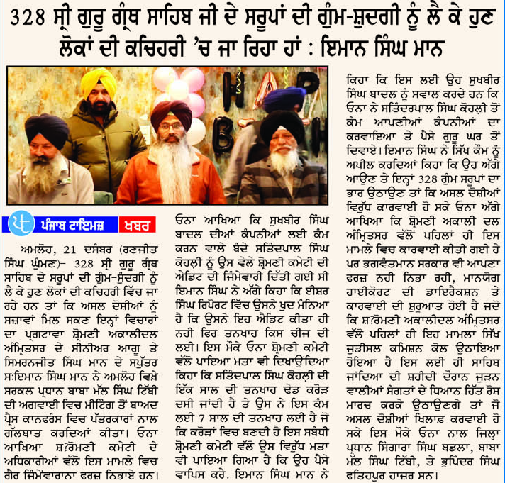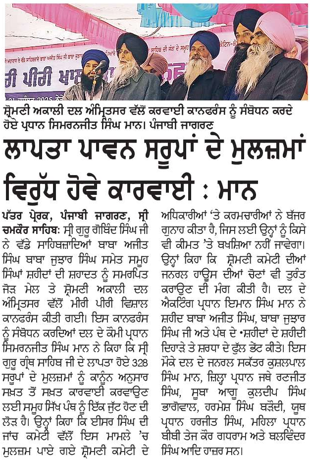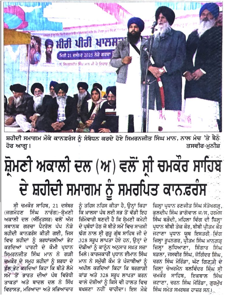 ਪਹਿਰੇਦਾਰ 22 December 2025 Post navigation ਇੰਡੀਆਂ ਦੀ ਵਿਧਾਨ ਘਾੜਤਾ ਕਮੇਟੀ ਵਿਚ 2 ਸਿੱਖ ਨੁਮਾਇੰਦਿਆ ਨੇ ਦਸਤਖਤ ਹੀ ਨਹੀ ਕੀਤੇ ਤਾਂ ਸਿੱਖ ਕੌਮ ਇਸਦੇ ਅਧੀਨ ਨਹੀ, ਬਲਕਿ ਪੂਰਨ ਰੂਪ ਵਿਚ ਆਜ਼ਾਦ ਹੈ : ਮਾਨ ਹਿਮਾਚਲ ਨੂੰ ਵੱਖਰਾ ਸੂਬਾ ਨਹੀ ਸੀ ਬਣਾਉਣਾ ਚਾਹੀਦਾ, ਕੈਂਸਰ ਸੰਬੰਧੀ ਹਿਮਾਚਲੀਆਂ ਦੀ ਔਕੜ ਹੈ ਤਾਂ ਉਹ ਸੰਗਰੂਰ ਦੇ ਹੋਮੀ ਭਾਬਾ ਹਸਪਤਾਲ ਵਿਚ ਇਲਾਜ ਕਰਵਾ ਸਕਦੇ ਹਨ : ਮਾਨ