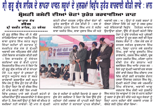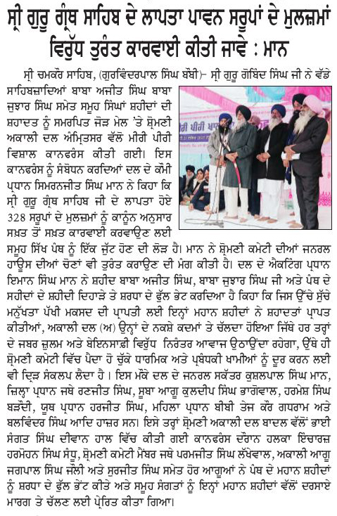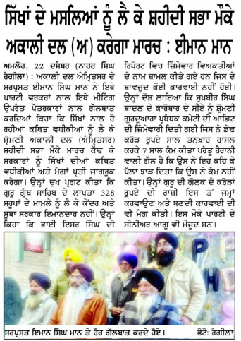ਪਹਿਰੇਦਾਰ 23 December 2025 ਰੋਜ਼ਾਨਾ ਸਪੋਕਸਮੈਨ 23 December 2025 ਸੱਚ ਦੀ ਪਟਾਰੀ 23 December 2025 Post navigation ਸ਼੍ਰੋਮਣੀ ਅਕਾਲੀ ਦਲ (ਅੰਮ੍ਰਿਤਸਰ) ਵੱਲੋ ਸ੍ਰੀ ਚਮਕੌਰ ਸਾਹਿਬ ਦੇ ਸ਼ਹੀਦੀ ਸਮਾਗਮ ਨੂੰ ਸਮਰਪਿਤ ਕਾਨਫਰੰਸ ਗਿਆਨੀ ਹਰਪ੍ਰੀਤ ਸਿੰਘ ਅਤੇ ਸ. ਸੁਖਬੀਰ ਸਿੰਘ ਬਾਦਲ ਦੇ ਬੀਜੇਪੀ-ਆਰ.ਐਸ.ਐਸ ਨਾਲ ਸੰਬੰਧਾਂ ਦੀ ਬਦੌਲਤ ਇਨ੍ਹਾਂ ਅਕਾਲੀ ਦਲਾਂ ਦੀ ਗੱਲ ਕੌਮ ਦੇ ਹਲਕ ਤੋਂ ਥੱਲ੍ਹੇ ਨਹੀ ਉੱਤਰਦੀ : ਮਾਨ