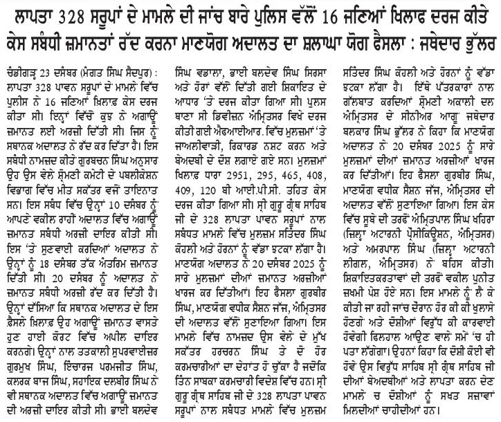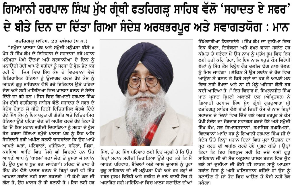 ਪਹਿਰੇਦਾਰ 24 December 2025 ਸੱਚ ਦੀ ਪਟਾਰੀ 24 December 2025 Post navigation ਹਿਮਾਚਲ ਨੂੰ ਵੱਖਰਾ ਸੂਬਾ ਨਹੀ ਸੀ ਬਣਾਉਣਾ ਚਾਹੀਦਾ, ਕੈਂਸਰ ਸੰਬੰਧੀ ਹਿਮਾਚਲੀਆਂ ਦੀ ਔਕੜ ਹੈ ਤਾਂ ਉਹ ਸੰਗਰੂਰ ਦੇ ਹੋਮੀ ਭਾਬਾ ਹਸਪਤਾਲ ਵਿਚ ਇਲਾਜ ਕਰਵਾ ਸਕਦੇ ਹਨ : ਮਾਨ ਸ੍ਰੀ ਗੁਰੂ ਗ੍ਰੰਥ ਸਾਹਿਬ ਦੇ ਲਾਪਤਾ ਪਾਵਨ ਸਰੂਪਾਂ ਦੇ ਮੁਲਜ਼ਮਾਂ ਵਿਰੁੱਧ ਤੁਰੰਤ ਕਾਰਵਾਈ ਕੀਤੀ ਜਾਵੇ : ਮਾਨ