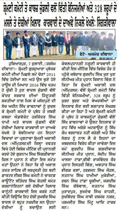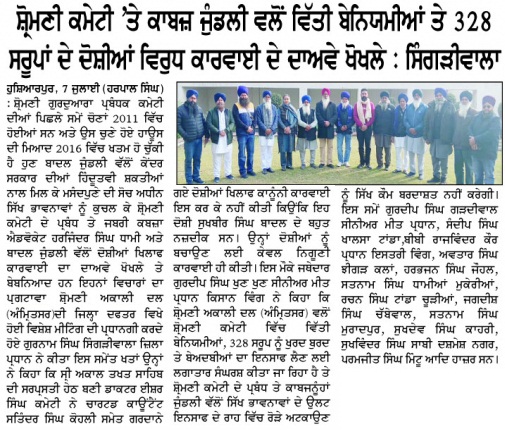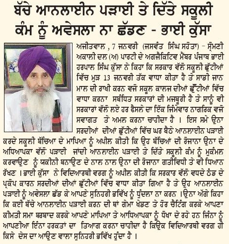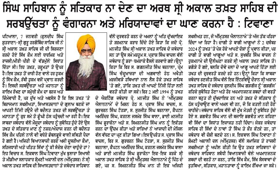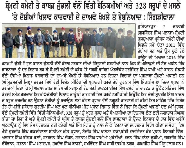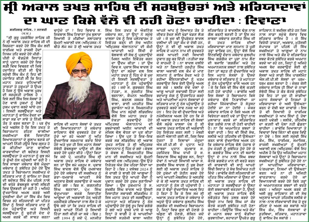 ਪਹਿਰੇਦਾਰ 08 January 2026 ਸੱਚ ਦੀ ਪਟਾਰੀ 08 January 2026 ਰੋਜ਼ਾਨਾ ਸਪੋਕਸਮੈਨ 08 January 2026 Post navigation ਘੱਟਗਿਣਤੀ ਕੌਮਾਂ, ਮੁਸਲਮਾਨ ਅਤੇ ਸਿੱਖ ਕੌਮ ਦੇ ਮਸਲਿਆ ਨੂੰ ਮੋਦੀ ਹਕੂਮਤ ਸਹਿਜ ਨਾਲ ਹੱਲ ਕਰੇ : ਮਾਨ 328 ਪਾਵਨ ਸਰੂਪਾਂ ਦਾ ਮਾਮਲਾ ਹੋਰ ਭਖਿਆ, ਸ਼੍ਰੋਮਣੀ ਕਮੇਟੀ ਨੂੰ ‘ਚੂੜੀਆਂ’ ਦੇਣ ਪੁੱਜਾ ਸ਼੍ਰੋਮਣੀ ਅਕਾਲੀ ਦਲ (ਅੰਮ੍ਰਿਤਸਰ) ਬੀਬੀਆਂ ਦਾ ਜੱਥਾਂ