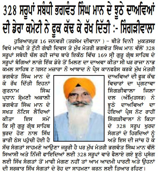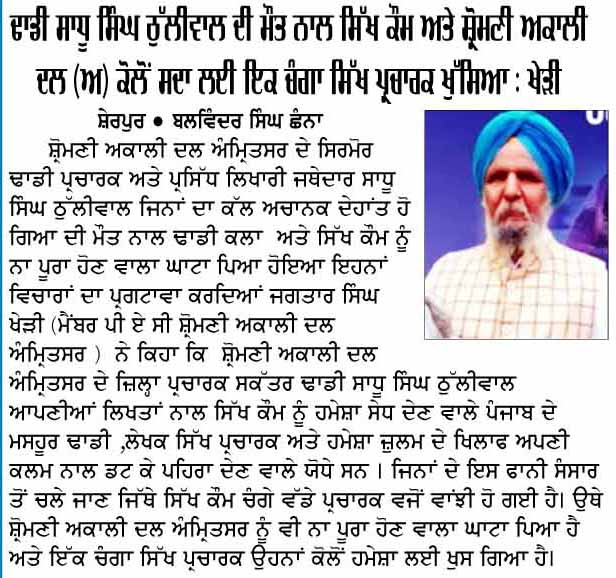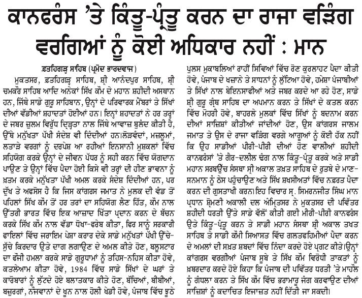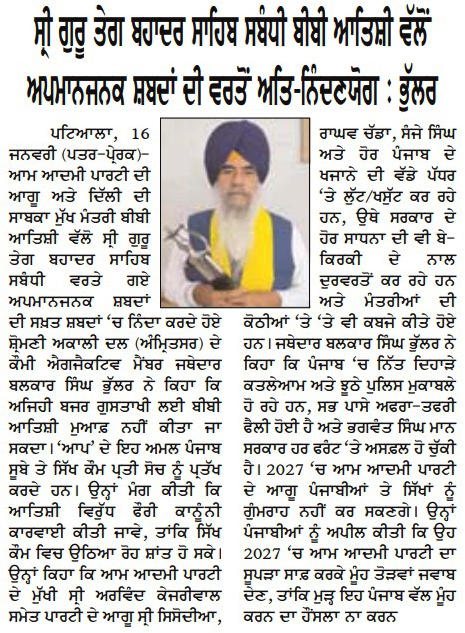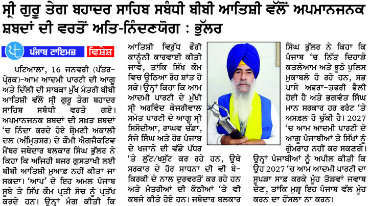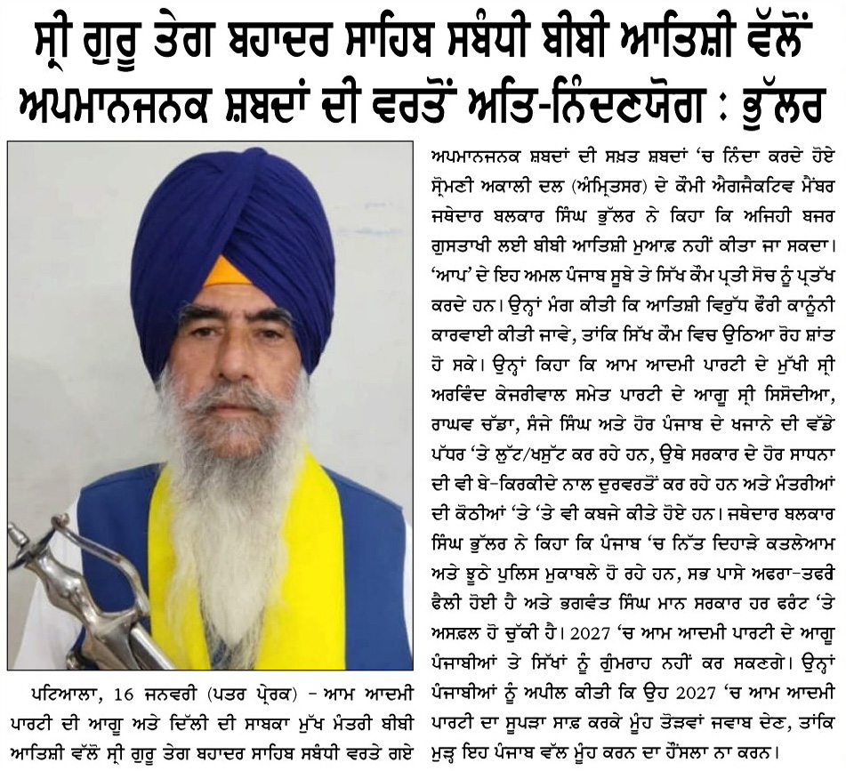 ਪਹਿਰੇਦਾਰ 17 January 2026 ਸੱਚ ਦੀ ਪਟਾਰੀ 17 January 2026 Post navigation ਸ਼੍ਰੋਮਣੀ ਅਕਾਲੀ ਦਲ (ਅੰਮ੍ਰਿਤਸਰ) ਨੇ ਸ੍ਰੀ ਤਖ਼ਤੂਪੁਰਾ ਸਾਹਿਬ ਵਿਖੇ ਕੀਤੀ ਮੀਰੀ ਪੀਰੀ ਕਾਨਫਰੰਸ ਚਾਰ ਪੰਥਕ ਜਥੇਬੰਦੀਆਂ ਨੇ 26 ਜਨਵਰੀ ਨੂੰ ਸਰਬੱਤ ਖ਼ਾਲਸਾ ਯਾਦਗਰੀ ਸਮਾਗਮ ਮਨਾਉਣ ਦਾ ਕੀਤਾ ਐਲਾਨ