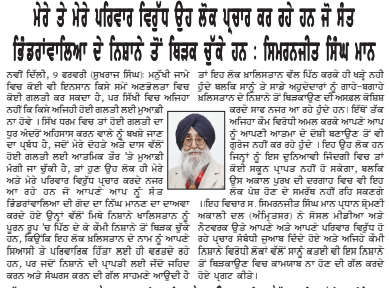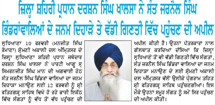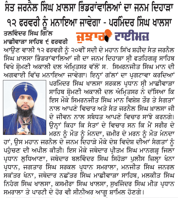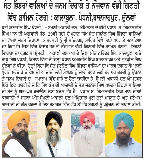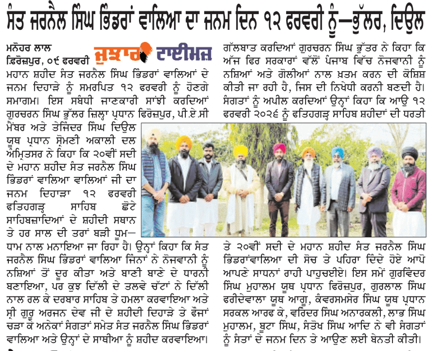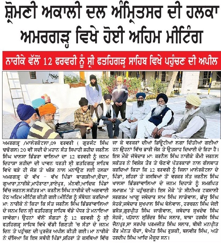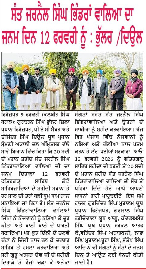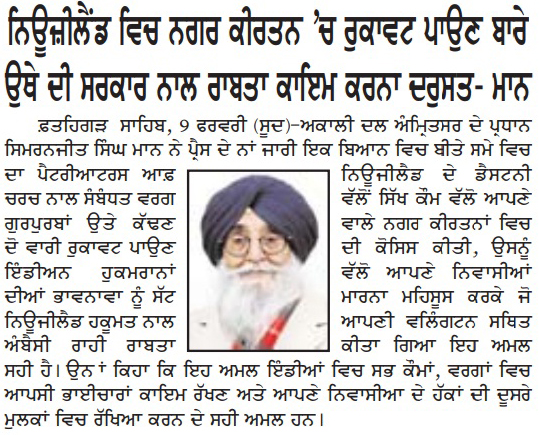ਪਹਿਰੇਦਾਰ 10 February 2026 Post navigation ਨਿਊਜੀਲੈਡ ਵਿਚ ਨਗਰ ਕੀਰਤਨ ਦੌਰਾਨ ਰੁਕਾਵਟ ਪਾਉਣ ਦੇ ਮੁੱਦੇ ਉਤੇ ਨਿਊਜੀਲੈਡ ਸਰਕਾਰ ਨਾਲ ਰਾਬਤਾ ਕਾਇਮ ਕਰਨਾ ਦਰੁਸਤ : ਮਾਨ ਸੰਤ ਜਰਨੈਲ ਸਿੰਘ ਖ਼ਾਲਸਾ ਭਿੰਡਰਾਂਵਾਲਿਆ ਦੇ ਜਨਮ ਦਿਹਾੜੇ ਮੌਕੇ ਸਮੂਲੀਅਤ ਕਰਨ ਦਾ ਫੈਸਲਾ