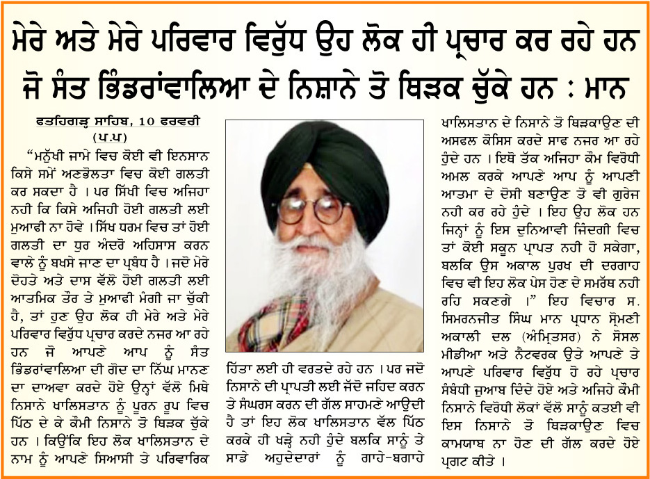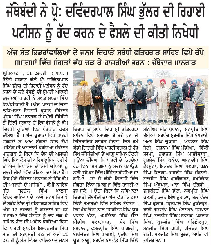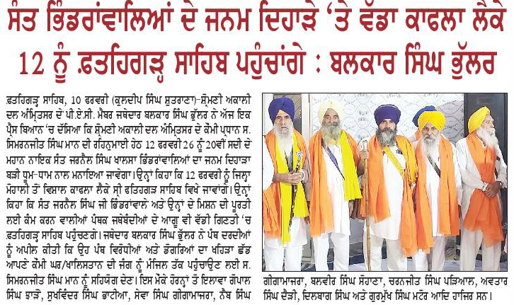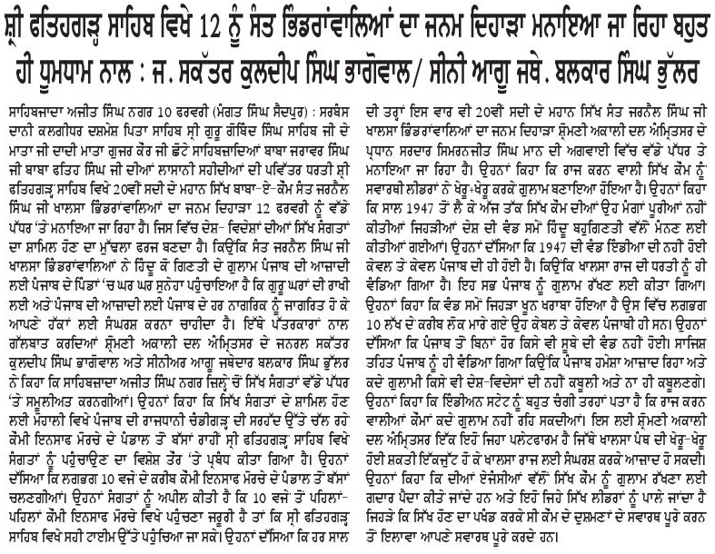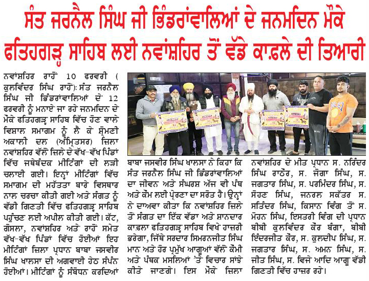 ਪਹਿਰੇਦਾਰ 11 February 2026 ਸੱਚ ਦੀ ਪਟਾਰੀ 11 February 2026 ਪਹਿਰੇਦਾਰ 12 February 2026 Post navigation ਸੰਤ ਜਰਨੈਲ ਸਿੰਘ ਭਿੰਡਰਾਂਵਾਲਿਆ ਦਾ ਜਨਮ ਦਿਹਾੜਾ 12 ਫਰਵਰੀ ਨੂੰ ਫਤਹਿਗੜ੍ਹ ਸਾਹਿਬ ਵਿਖੇ ਸ਼ਰਧਾ ਅਤੇ ਉਤਸਾਹ ਨਾਲ ਮਨਾਇਆ ਜਾਵੇਗਾ ਕੌਮੀ ਮੰਜਿਲ ਖ਼ਾਲਿਸਤਾਨ ਕਾਇਮ ਕਰਦੇ ਹੋਏ ‘ਸਰਬੱਤ ਦੇ ਭਲੇ’ ਦੇ ਮਨੁੱਖਤਾ ਪੱਖੀ ਮਿਸਨ ਨੂੰ ਮੁੱਖ ਰੱਖਿਆ ਜਾਵੇਗਾ : ਮਾਨ