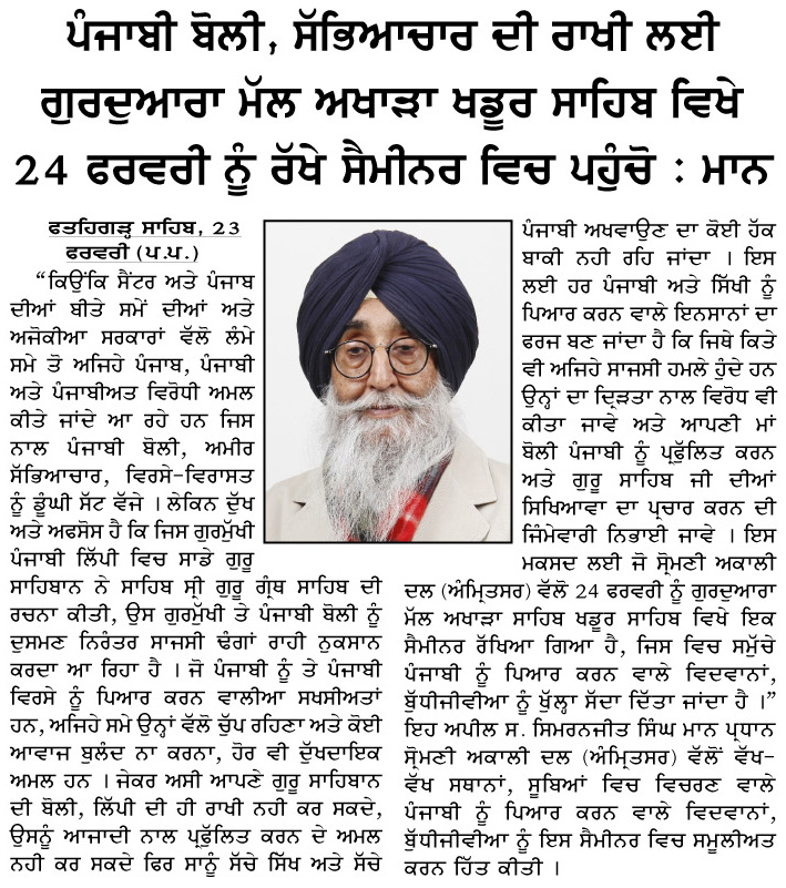 ਪਹਿਰੇਦਾਰ 24 February 2026 ਸੱਚ ਦੀ ਪਟਾਰੀ 24 February 2026 Post navigation 24 ਫਰਵਰੀ ਨੂੰ ਗੁਰਦੁਆਰਾ ਮੱਲ ਅਖਾੜਾ ਸਾਹਿਬ ਖਡੂਰ ਸਾਹਿਬ ਵਿਖੇ ਪੰਜਾਬੀ ਮਾਂ ਬੋਲੀ ਦਿਹਾੜਾ ਮਨਾਇਆ ਜਾਵੇਗਾ : ਇਮਾਨ ਸਿੰਘ ਮਾਨ ਖਡੂਰ ਸਾਹਿਬ ਵਿਖੇ ਸ਼੍ਰੋਮਣੀ ਅਕਾਲੀ ਦਲ (ਅੰਮ੍ਰਿਤਸਰ) ਵੱਲੋ ਪੰਜਾਬੀ ਮਾਂ ਬੋਲੀ ਦਿਹਾੜਾ ਮਨਾਇਆ