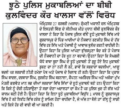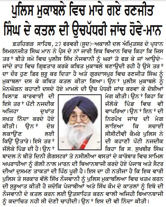 ਪਹਿਰੇਦਾਰ 28 February 2026 ਸੱਚ ਦੀ ਪਟਾਰੀ 28 February 2026 Post navigation ਬੰਦੀ ਸਿੰਘਾਂ ਨੂੰ ਪੈਰੋਲ ਨਾ ਦੇਣਾ ਮਨੁੱਖੀ ਅਧਿਕਾਰਾਂ ਦਾ ਘਾਣ : ਬਾਦਸ਼ਾਹਪੁਰ ਸ੍ਰੀ ਟਰੰਪ ਆਪ੍ਰੇਸ਼ਨ ਸਿੰਧੂਰ ਸਮੇਂ ਜੰਗਬੰਦੀ ਨਾ ਕਰਵਾਉਦੇ ਤਾਂ ਵੱਡਾ ਨੁਕਸਾਨ ਹੁੰਦਾ : ਮਾਨ