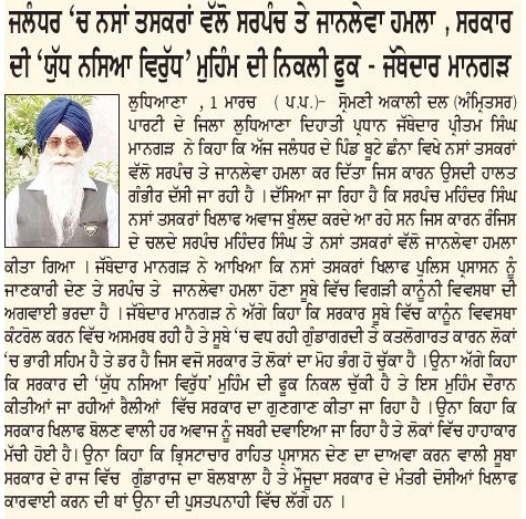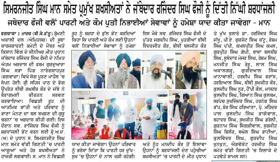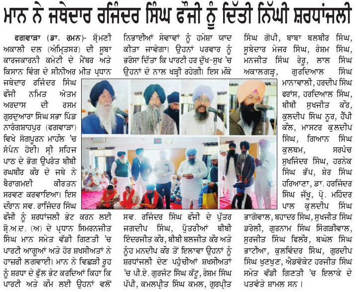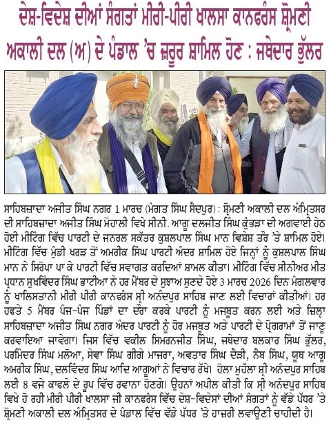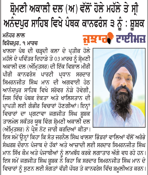 ਪਹਿਰੇਦਾਰ 02 March 2026 Post navigation ਸ੍ਰੀ ਟਰੰਪ ਆਪ੍ਰੇਸ਼ਨ ਸਿੰਧੂਰ ਸਮੇਂ ਜੰਗਬੰਦੀ ਨਾ ਕਰਵਾਉਦੇ ਤਾਂ ਵੱਡਾ ਨੁਕਸਾਨ ਹੁੰਦਾ : ਮਾਨ ਪੰਜਾਬ ਸੂਬੇ ਦੀ ਮਲਕੀਅਤ ਜਰਖੇਜ ਧਰਤੀ ਵਿਚੋਂ ਪ੍ਰਵਾਸੀ ਮਜਦੂਰਾਂ ਨੂੰ ਪਲਾਟ ਕੱਟਕੇ ਦੇਣ ਦੇ ਅਮਲ ਪੰਜਾਬ ਵਿਰੋਧੀ ਅਤੇ ਅਸਹਿ : ਇਮਾਨ ਸਿੰਘ ਮਾਨ