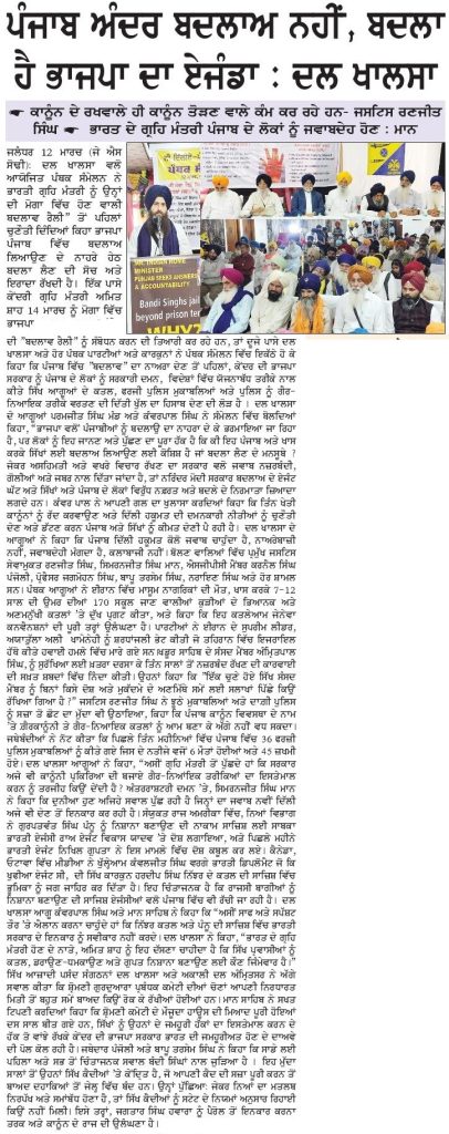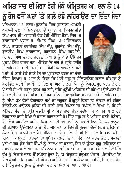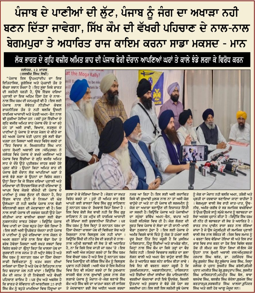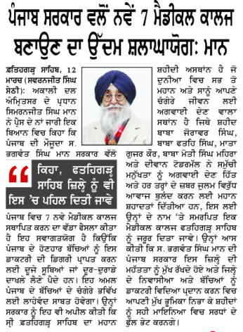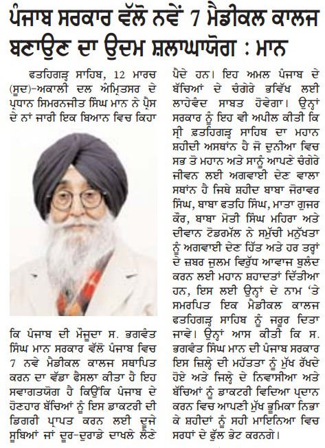 ਪਹਿਰੇਦਾਰ 13 March 2026 ਸੱਚ ਦੀ ਪਟਾਰੀ 13 March 2026 ਰੋਜ਼ਾਨਾ ਸਪੋਕਸਮੈਨ 13 March 2026 Post navigation ਅਮਰੀਕਾ-ਇਜਰਾਇਲ ਅਤੇ ਇਰਾਨ ਦੀ ਤਾਜਾ ਜੰਗ ਦੀਆਂ ਤਕਨੀਕਾਂ ਨੇ ਪ੍ਰਤੱਖ ਕਰ ਦਿੱਤਾ ਹੈ ਕਿ ਕਿਸੇ ਵੀ ਮੁਲਕ ਦਾ ਮੁੱਖੀ ਸੁਰੱਖਿਅਤ ਨਹੀਂ : ਮਾਨ ਕੌਮੀ ਚੁਣੋਤੀਆਂ ਬਾਰੇ ਵਿਚਾਰਾਂ ਲਈ ਵਿਸਾਖੀ ਮੌਕੇ ਦਮਦਮਾ ਸਾਹਿਬ ਵਿਖੇ ਕਰਾਂਗੇ ਵੱਡੀ ਇਕੱਤਰਤਾ : ਇਮਾਨ ਸਿੰਘ ਮਾਨ