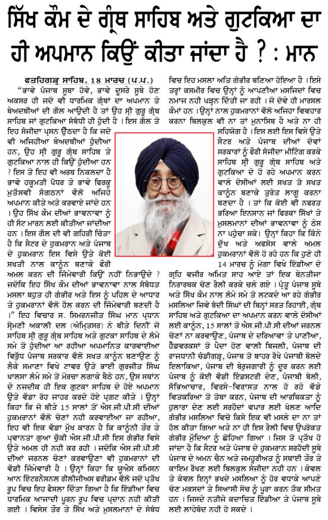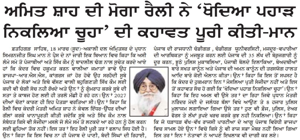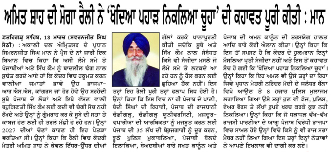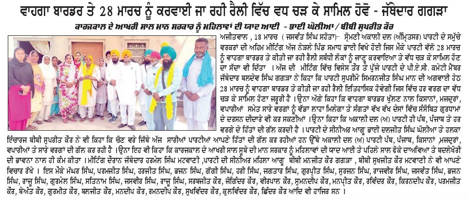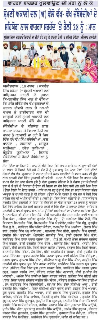 ਪਹਿਰੇਦਾਰ 19 March 2026 ਸੱਚ ਦੀ ਪਟਾਰੀ 19 March 2026 Post navigation ਵਾਹਗਾ ਬਾਰਡਰ ਕਾਨਫਰੰਸ ਲਈ ਸ਼੍ਰੋਮਣੀ ਅਕਾਲੀ ਦਲ (ਅੰਮ੍ਰਿਤਸਰ) ਜਿ਼ਲ੍ਹਾ ਗੁਰਦਾਸਪੁਰ ਦੀ ਮੀਟਿੰਗ ਹੋਈ ਬਾਰਡਰ ਦੇ ਸਾਏ ਤੋਂ ਵਿਕਾਸ ਦੀ ਰੌਸਨੀ ਵੱਲ: ਮਾਝੇ ਨੂੰ ਆਰਥਿਕ ਰਾਹਦਾਰੀ ਬਣਾਉਣ ਦੀ ਮੰਗ ਲਈ ਮਾਰਚ ਨੂੰ ਅਟਾਰੀ-ਵਾਹਗਾ ਤੇ ‘ਬਾਰਡਰ ਖੋਲੋ ਰੈਲੀ’ ਦਾ ਐਲਾਨ