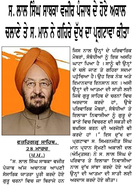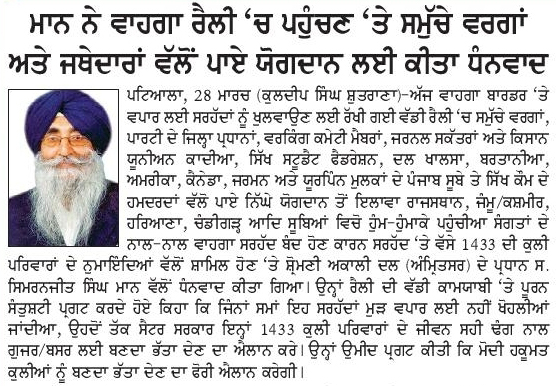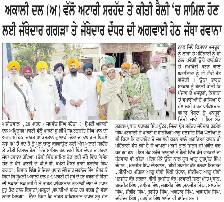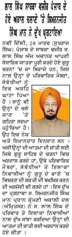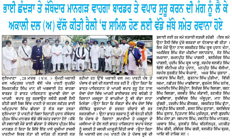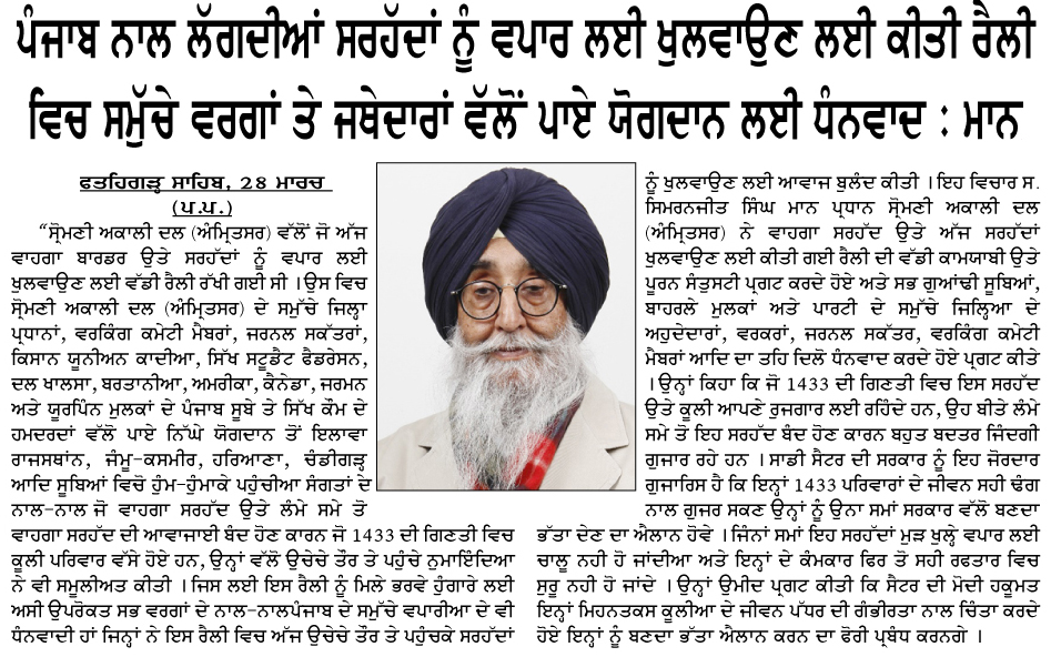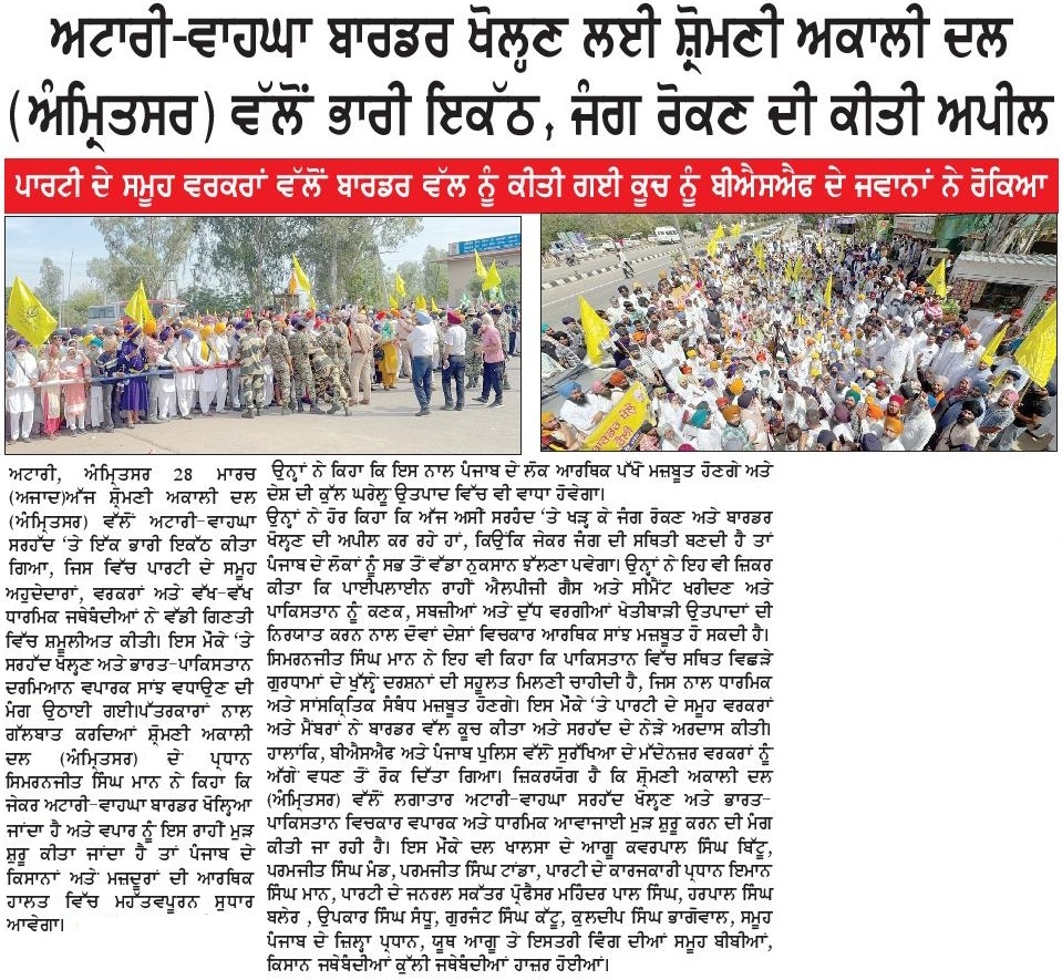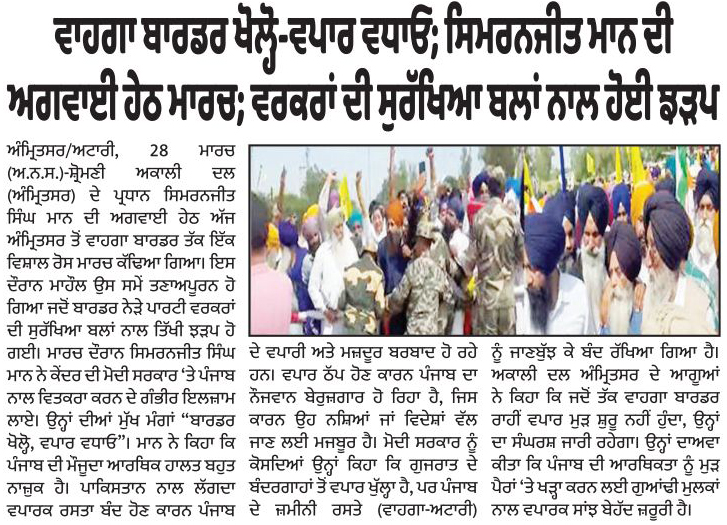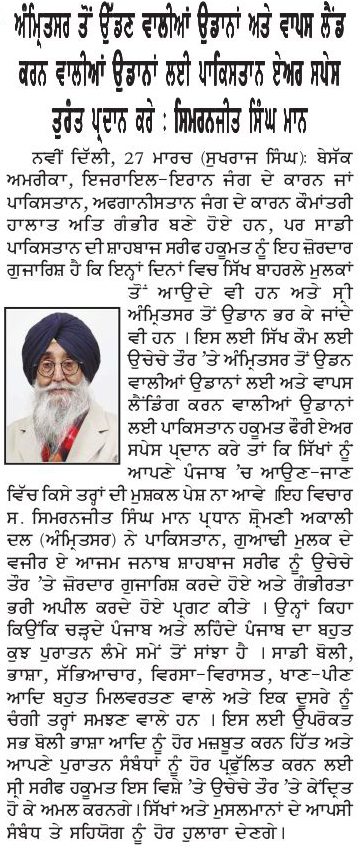 ਪਹਿਰੇਦਾਰ 29 March 2026 ਸੱਚ ਦੀ ਪਟਾਰੀ 29 March 2026 ਰੋਜ਼ਾਨਾ ਸਪੋਕਸਮੈਨ 29 March 2026 Post navigation ਅੰਮ੍ਰਿਤਸਰ ਤੋਂ ਆਉਣ-ਜਾਣ ਵਾਲੀਆਂ ਉਡਾਨਾਂ ਲਈ ਪਾਕਿਸਤਾਨ ਏਅਰ ਸਪੇਸ ਪ੍ਰਦਾਨ ਕਰੇ : ਮਾਨ ਅੰਮ੍ਰਿਤਸਰ ਵਾਲੀਆਂ ਉਡਾਨਾਂ ਅਤੇ ਵਾਪਸ ਲੈਂਡ ਲਈ ਪਾਕਿਸਤਾਨ ਏਅਰ ਸਪੇਸ ਤੁਰੰਤ ਦਵੇ : ਮਾਨ