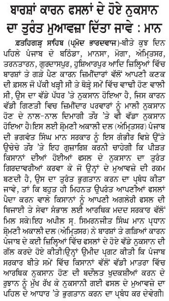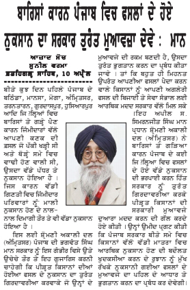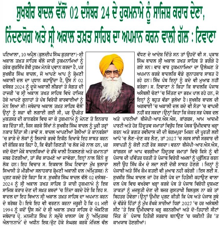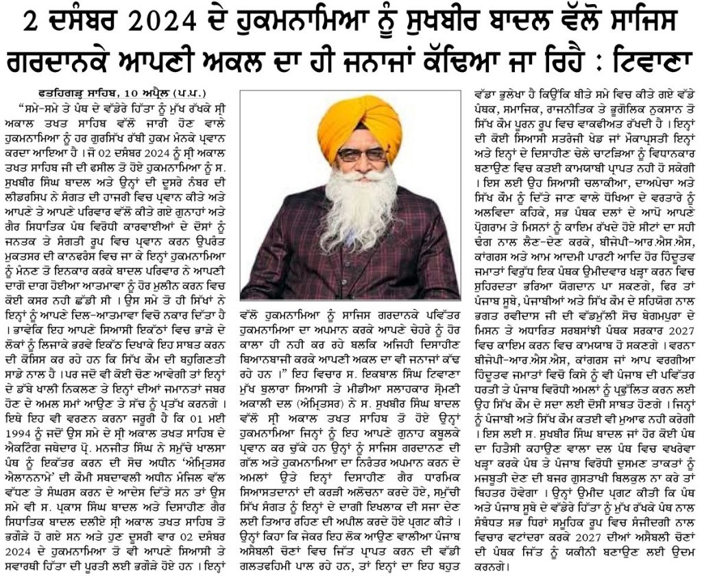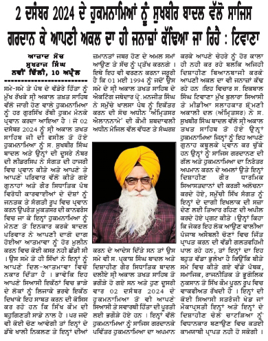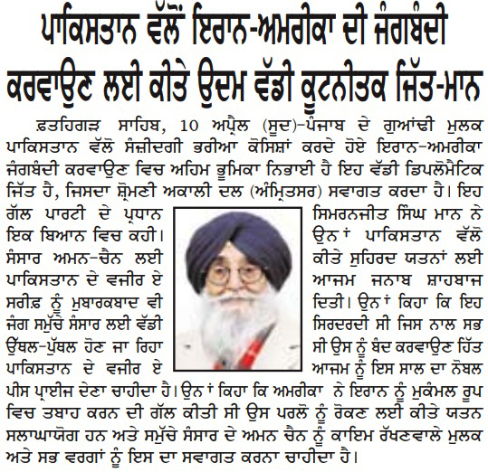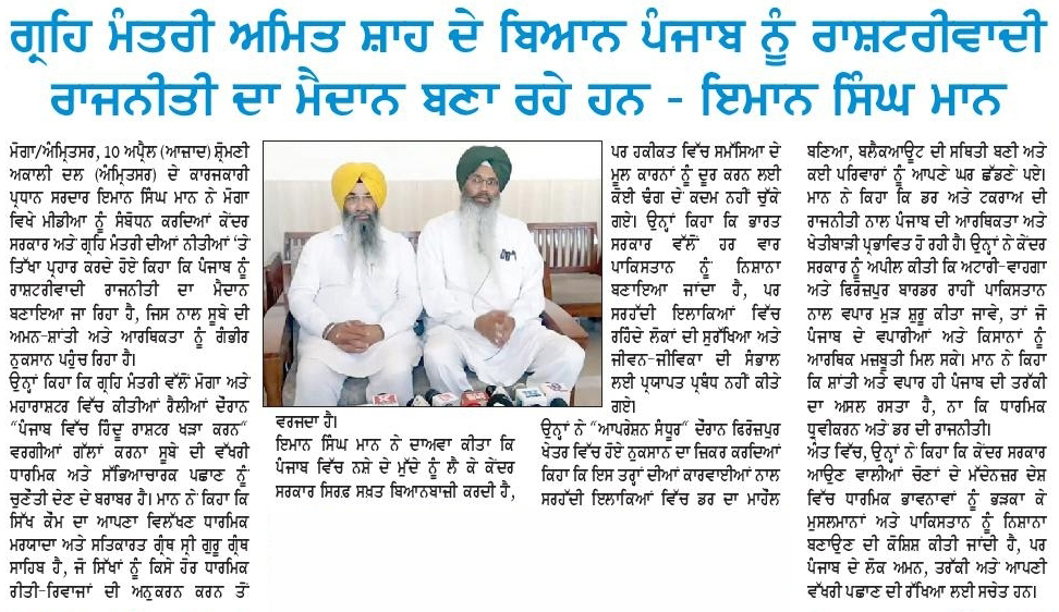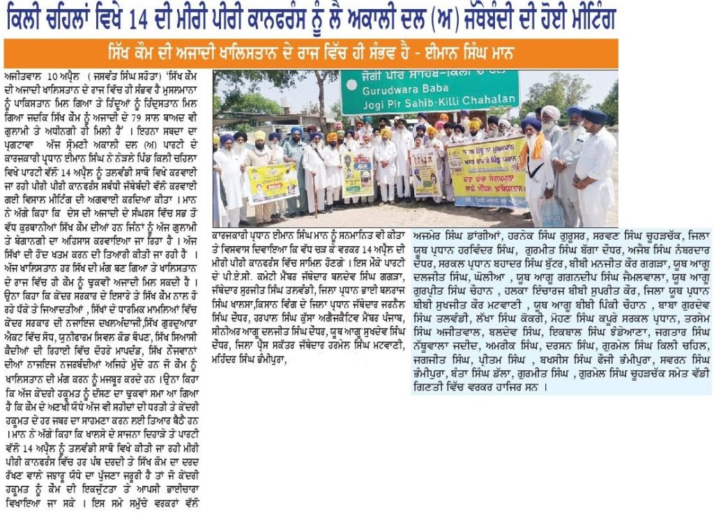 ਪਹਿਰੇਦਾਰ 11 April 2026 ਸੱਚ ਦੀ ਪਟਾਰੀ 11 April 2026 Post navigation ਇਰਾਨ ਦੂਤਵਾਸ ਦੇ ਡਿਪਟੀ ਸਫੀਰ ਜਨਾਬ ਮੁਹੰਮਦ ਹੂਸੈਨ ਦਾ ਸ੍ਰੀ ਦਰਬਾਰ ਸਾਹਿਬ ਆਉਣ ਤੇ ਭਰਪੂਰ ਸਵਾਗਤ : ਮਾਨ ਸ਼੍ਰੋਮਣੀ ਅਕਾਲੀ ਦਲ (ਅੰਮ੍ਰਿਤਸਰ) ਵੱਲੋਂ ਵਿਸਾਖੀ ਮੌਕੇ ਵਿਸ਼ਾਲ ਪੰਥਕ ਕਾਨਫਰੰਸ 14 ਨੂੰ : ਹਰਭਜਨ ਸਿੰਘ ਕਸ਼ਮੀਰੀ