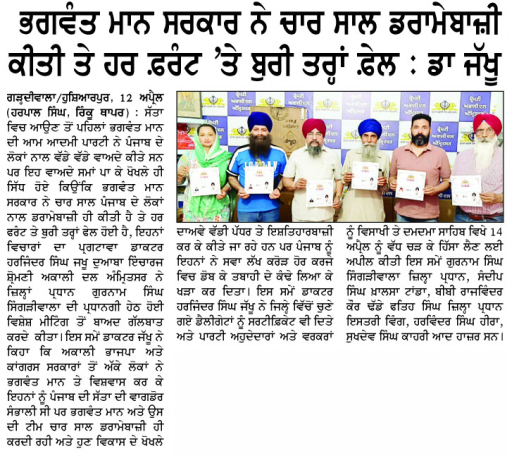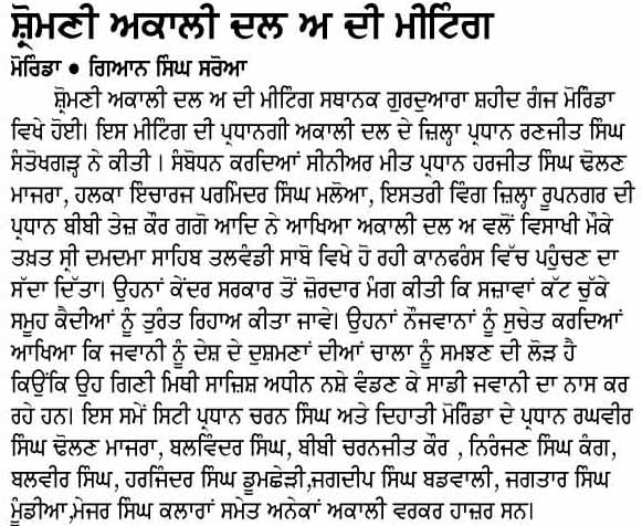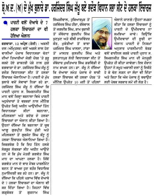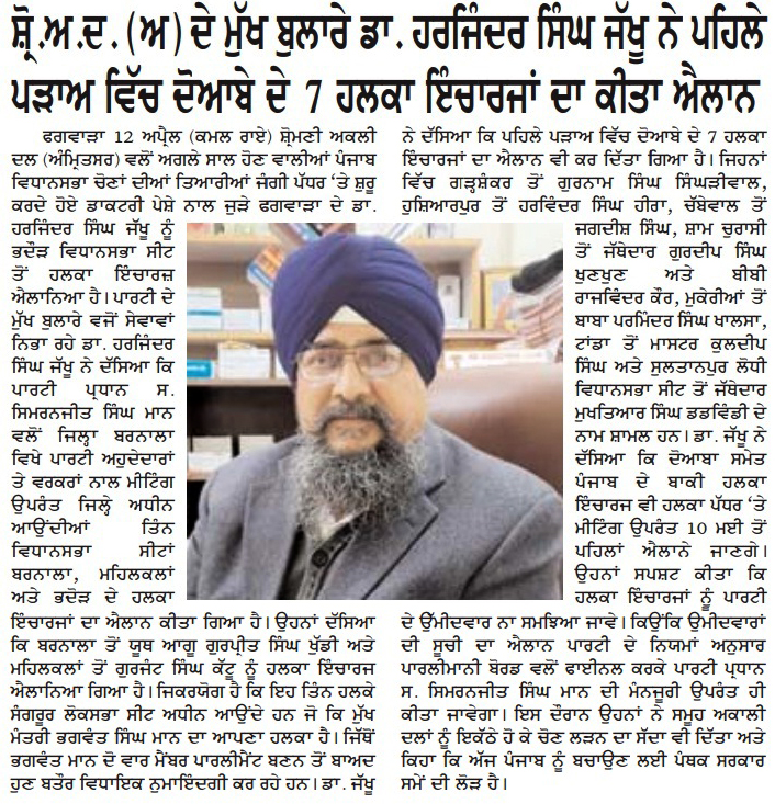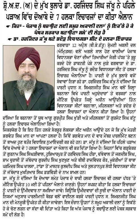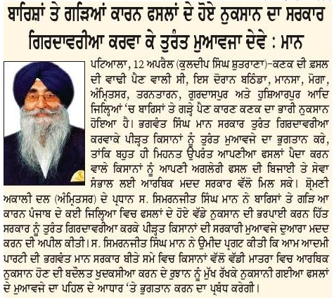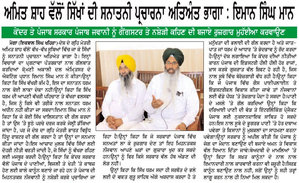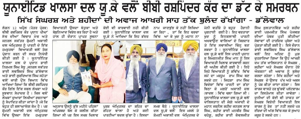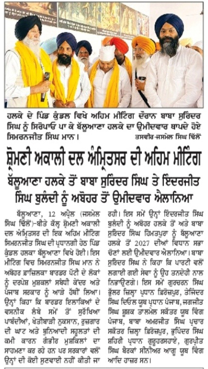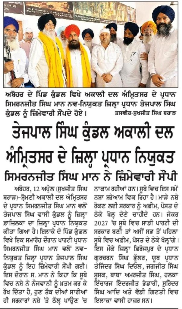 ਅਜੀਤ 13 April 2026 ਪਹਿਰੇਦਾਰ 13 April 2026 ਰੋਜ਼ਾਨਾ ਸਪੋਕਸਮੈਨ 13 April 2026 Post navigation ਸ਼੍ਰੋਮਣੀ ਅਕਾਲੀ ਦਲ (ਅੰਮ੍ਰਿਤਸਰ) ਵੱਲੋਂ ਵਿਸਾਖੀ ਮੌਕੇ ਵਿਸ਼ਾਲ ਪੰਥਕ ਕਾਨਫਰੰਸ 14 ਨੂੰ : ਹਰਭਜਨ ਸਿੰਘ ਕਸ਼ਮੀਰੀ ਪੰਥਕ ਸੰਮੇਲਨ ‘ਚ ਸ਼੍ਰੋਮਣੀ ਅਕਾਲੀ ਦਲ (ਅੰਮ੍ਰਿਤਸਰ) ਤੇ ਪੰਥਕ ਲੀਡਰਸਿ਼ਪ ਨੇ ਵੱਖ-ਵੱਖ ਮਤੇ ਪਾਸ ਕੀਤੇ