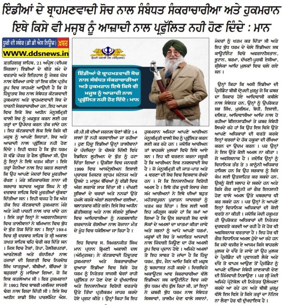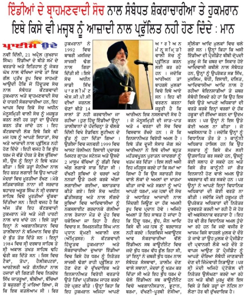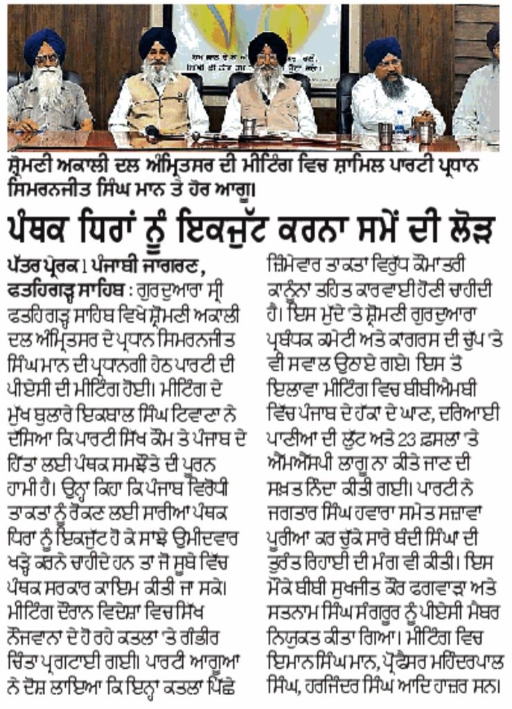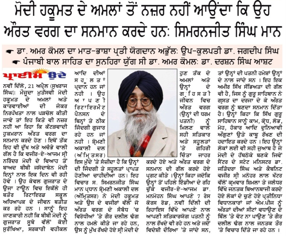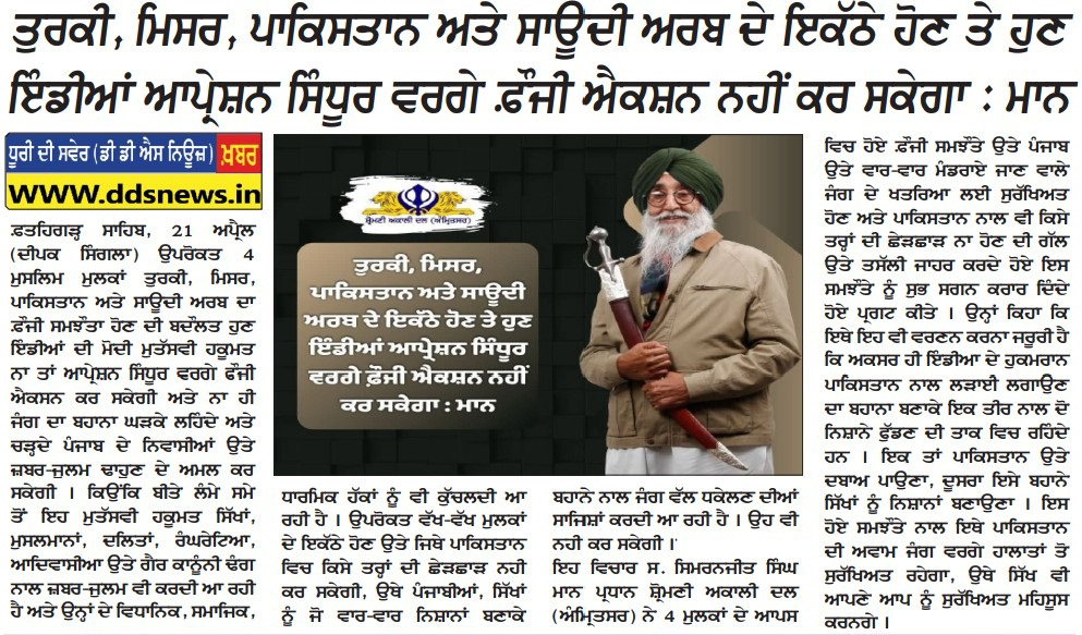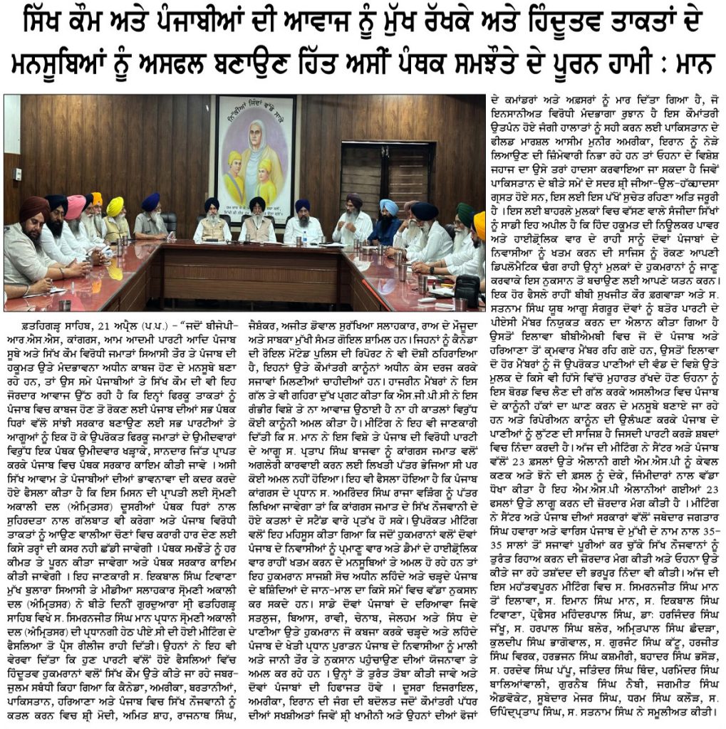 ਪਹਿਰੇਦਾਰ 22 April 2026 ਸੱਚ ਦੀ ਪਟਾਰੀ 22 April 2026 Post navigation ਸਿਮਰਨਜੀਤ ਸਿੰਘ ਮਾਨ ਦੀ ਪ੍ਰਧਾਨਗੀ ਹੇਠ ਹੋਈ ਪੀ.ਏ.ਸੀ ਦੀ ਮੀਟਿੰਗ ਨੇ ਲਏ ਅਹਿਮ ਫੈਸਲੇ