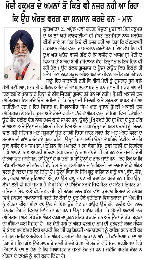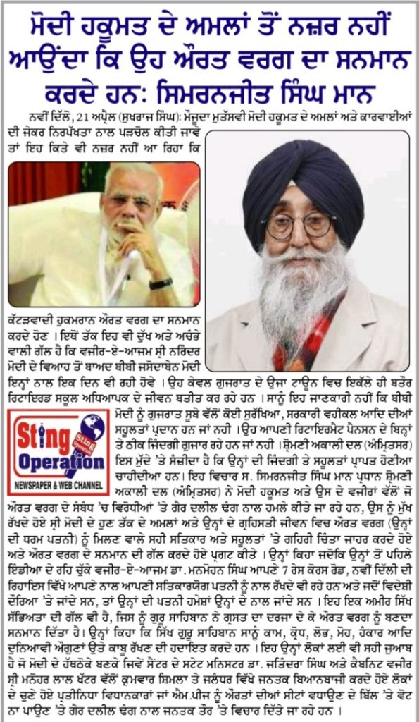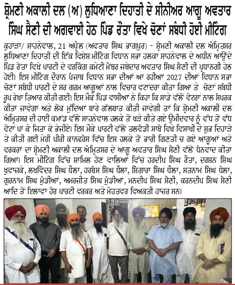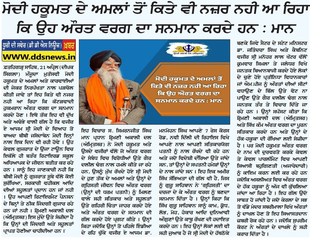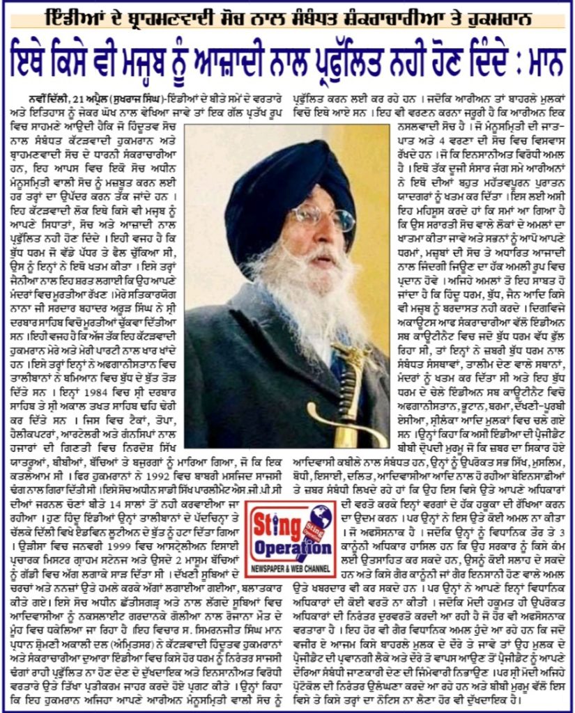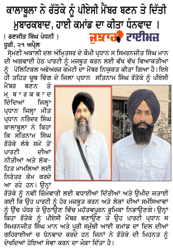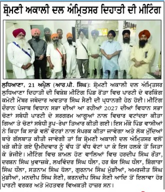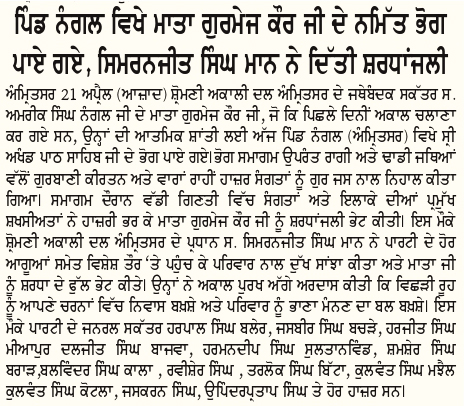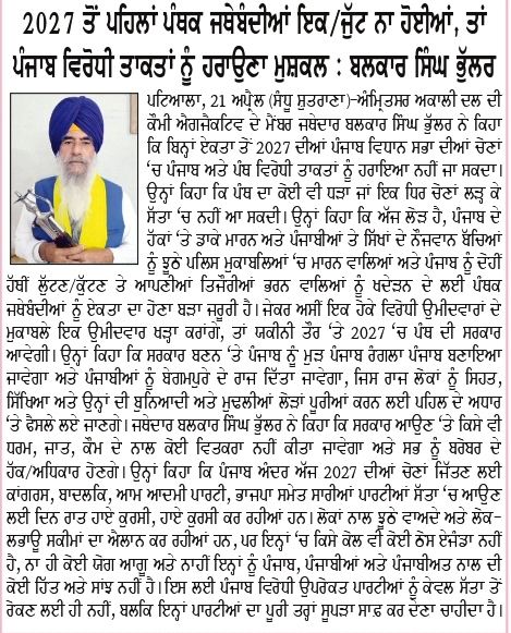 ਪਹਿਰੇਦਾਰ 22 April 2026 ਸੱਚ ਦੀ ਪਟਾਰੀ 22 April 2026 Post navigation ਸਿਮਰਨਜੀਤ ਸਿੰਘ ਮਾਨ ਦੀ ਪ੍ਰਧਾਨਗੀ ਹੇਠ ਹੋਈ ਪੀ.ਏ.ਸੀ ਦੀ ਮੀਟਿੰਗ ਨੇ ਲਏ ਅਹਿਮ ਫੈਸਲੇ