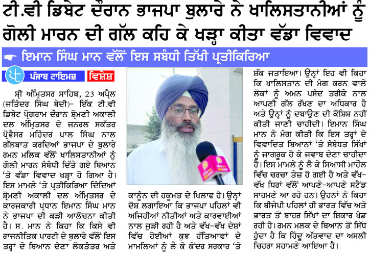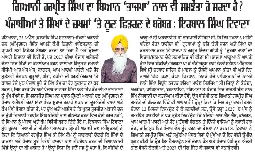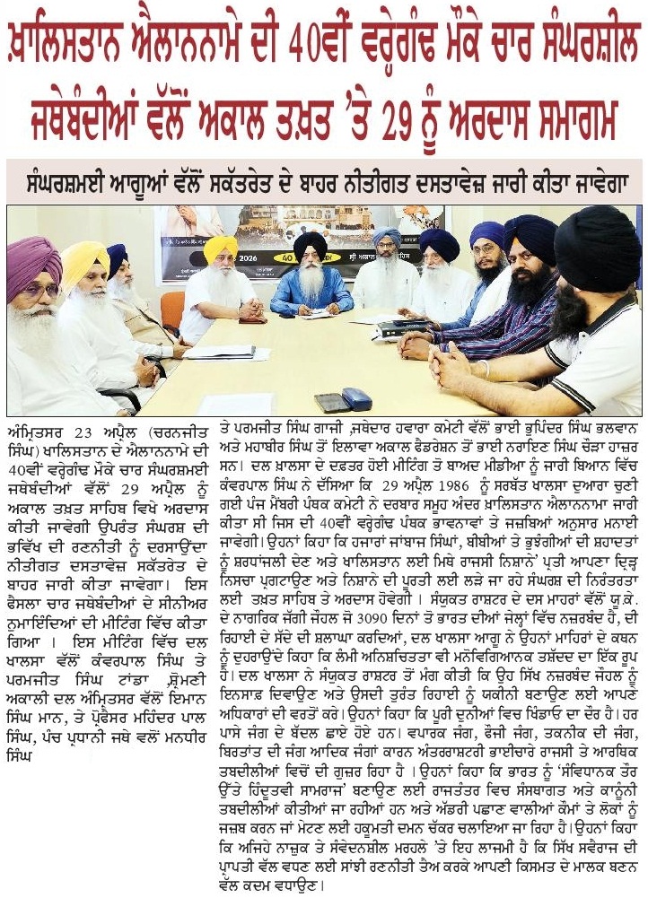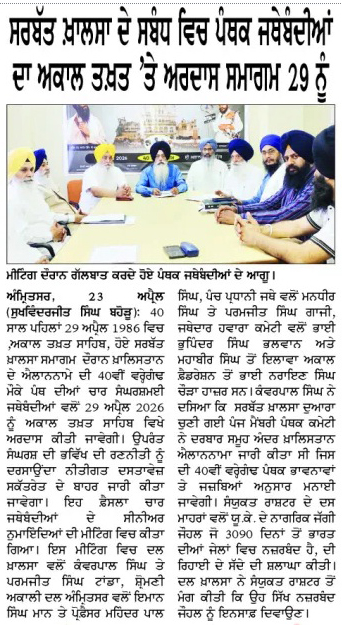 ਪਹਿਰੇਦਾਰ 24 April 2026 ਰੋਜ਼ਾਨਾ ਸਪੋਕਸਮੈਨ 24 April 2026 Post navigation ਪਾਕਿਸਤਾਨ ਦੀਆਂ ਅਮਨ ਸ਼ਾਂਤੀ ਕੋਸਿ਼ਸ਼ਾਂ ਲਈ ਆਸੀਮ ਮੁਨੀਰ ਨੋਬਲ ਸ਼ਾਂਤੀ ਪੁਰਸਕਾਰ ਦੇ ਹੱਕਦਾਰ : ਮਾਨ