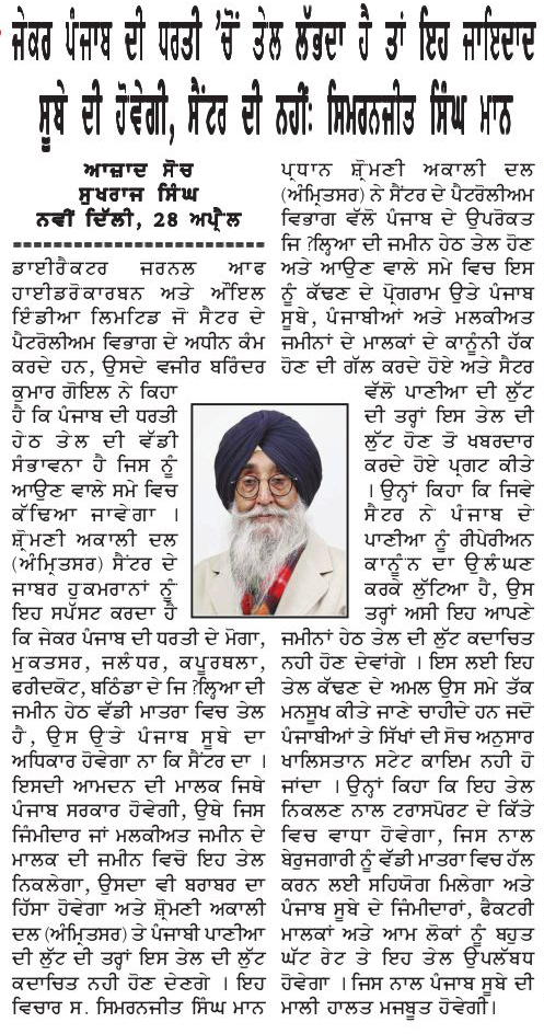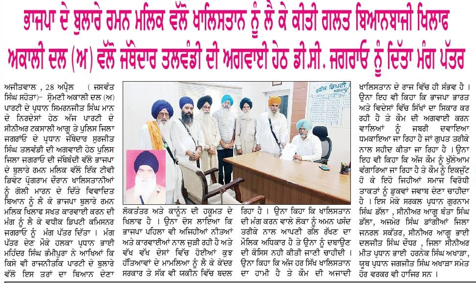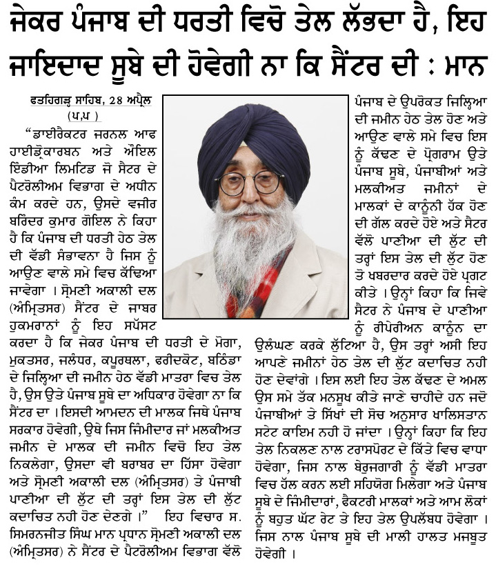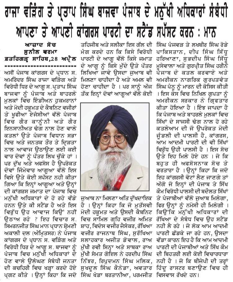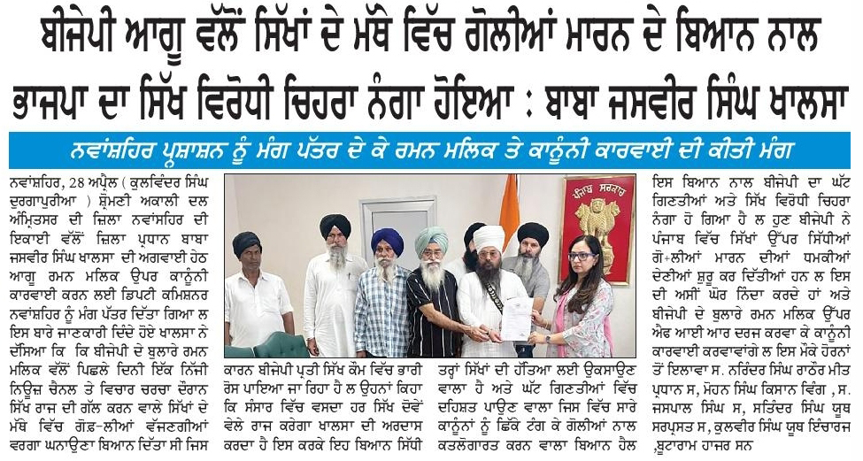 ਪਹਿਰੇਦਾਰ 28 April 2026 ਸੱਚ ਦੀ ਪਟਾਰੀ 29 April 2026 Post navigation ਦੋ ਦਲਾਂ ਦੀ ਤਾਲਮੇਲ ਕਮੇਟੀ ਵੱਲੋਂ ਝੂੰਦਾਂ ਨੇ ਸਿਮਰਨਜੀਤ ਸਿੰਘ ਮਾਨ ਨਾਲ ਕੀਤੀ ਗੱਲਬਾਤ