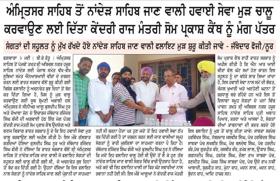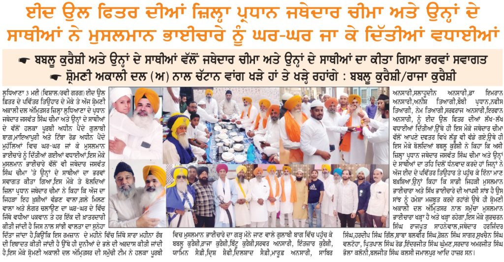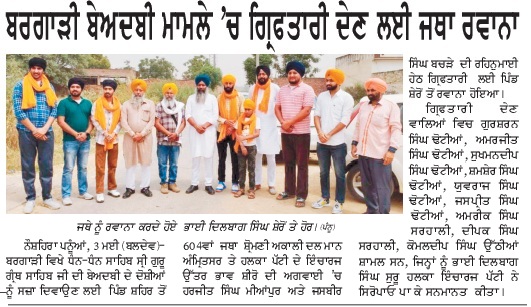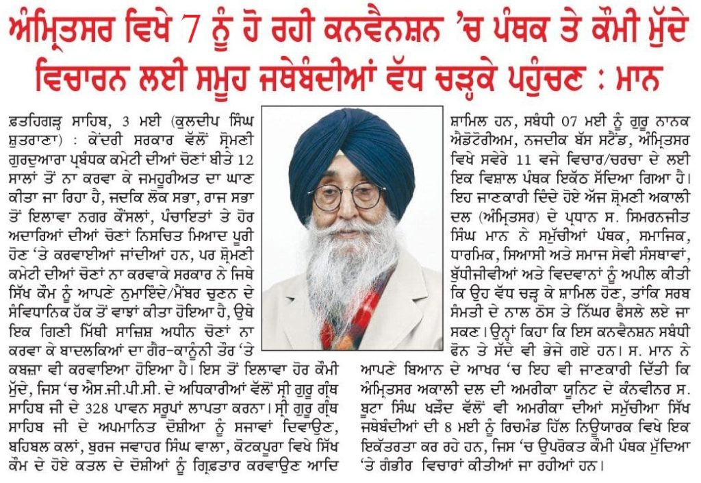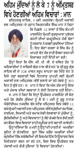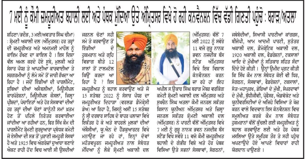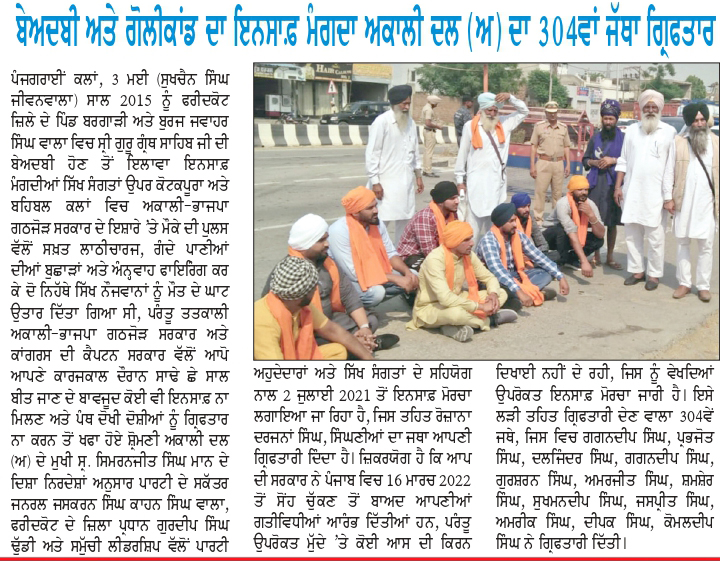 ਪਹਿਰੇਦਾਰ 04 May 2022 ਜਗਬਾਣੀ 04 May 2022 Post navigation ਸ਼੍ਰੋਮਣੀ ਅਕਾਲੀ ਦਲ (ਅੰਮ੍ਰਿਤਸਰ) ਵੱਲੋਂ ਪਟਿਆਲਾ ਹਿੰਸਾ ਮਾਮਲੇ ਦੇ ਵਿਚ ਸਿੱਖਾਂ ਉਪਰ ਗੈਰਕਾਨੂੰਨੀ ਤਸੱਦਦ ਰੋਕਣ ਲਈ ਦਿੱਤਾ ਮੰਗ ਪੱਤਰ ਪਟਿਆਲਾ ਹਿੰਸਕ ਘਟਨਾ ‘ਚ ਸਿੱਖ ਕੌਮ ਤੇ ਸਿੱਖ ਨੌਜ਼ਵਾਨਾਂ ਦਾ ਰਤੀਭਰ ਵੀ ਦੋਸ਼ ਨਹੀਂ : ਮਾਨ